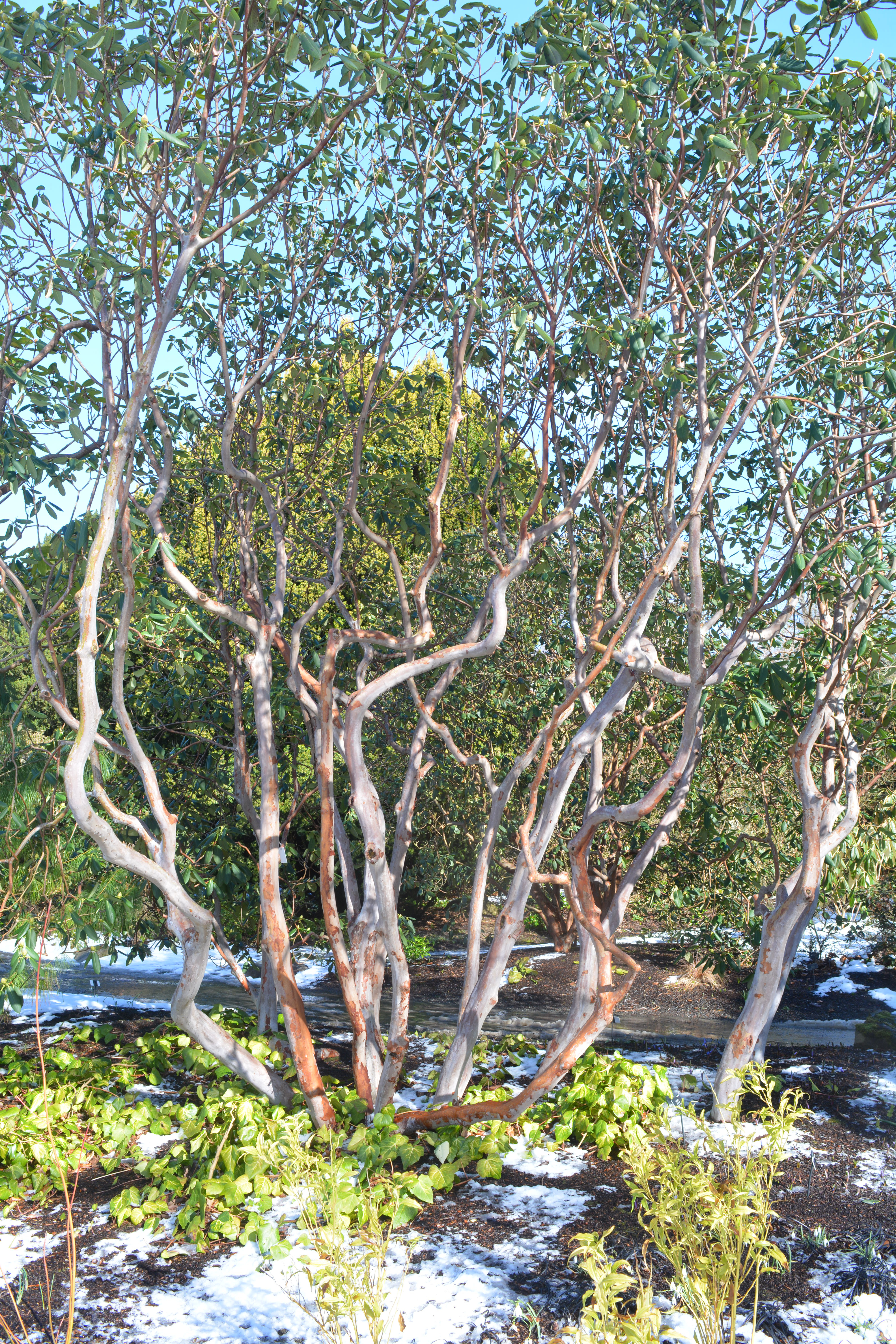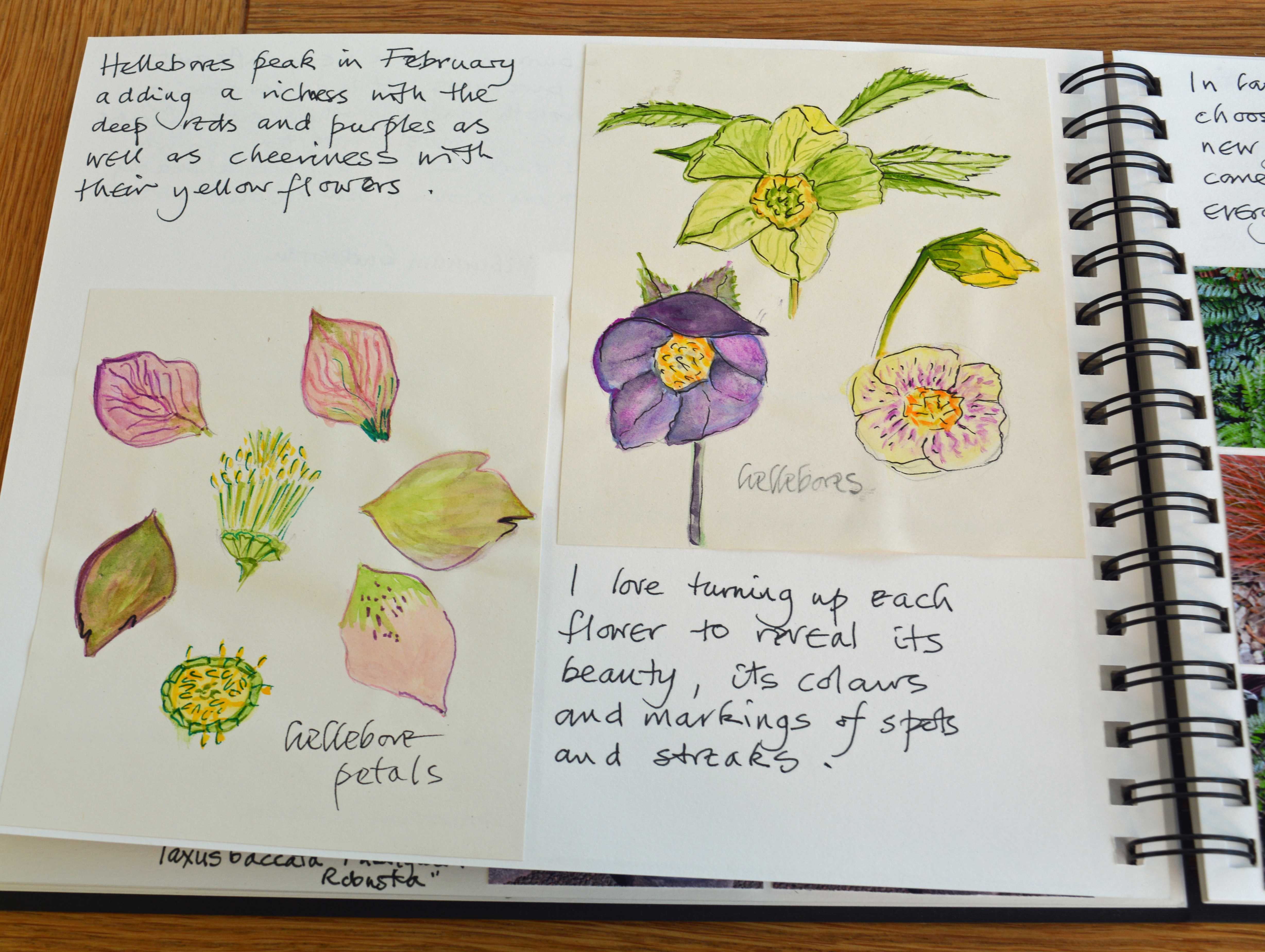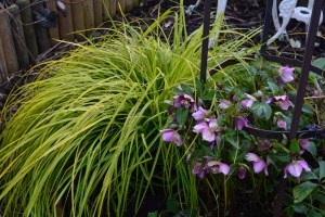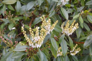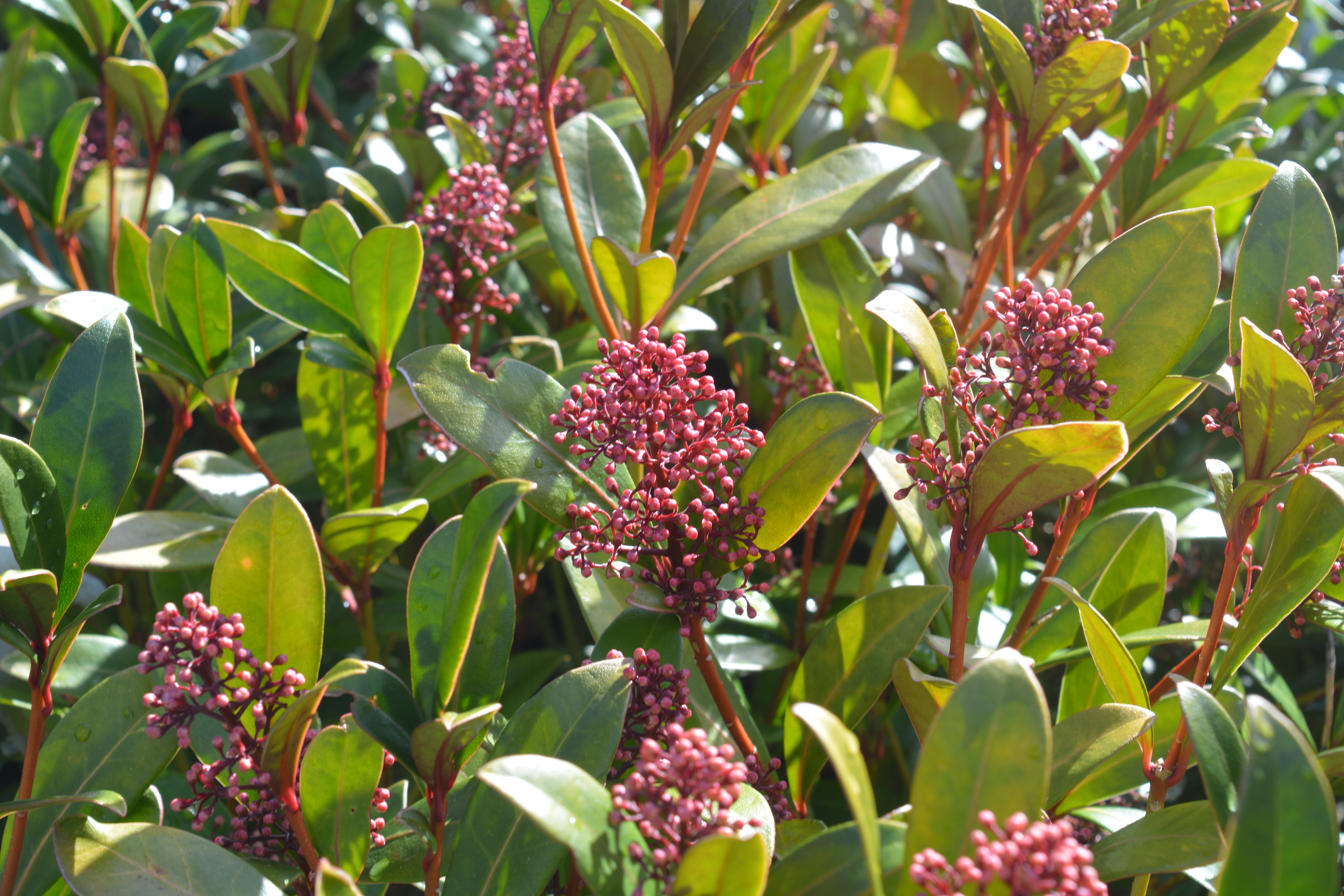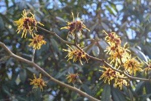 Skimmia “Kew Green” has unusual green flowers instead of the usual reddish shades, while the Witch Hazels sport many shades of yellow.