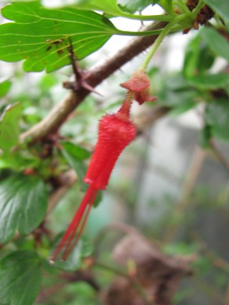The newest addition to the garden, just planted today, is the dark foliaged Euphorbia "Redwing", spotted with fresh rain drops following a shower.This brightly flowered quince, Chaenomeles "Fire Dance", glows at the drive entrance, providing a cheerful welcome.