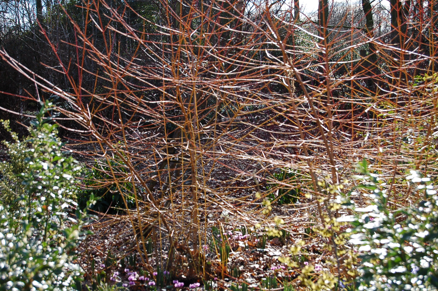In the first few months of each new year the garden treats us to a colourful show of bright and varied coloured stems of shrubs. The most colourful are the dogwoods and willows of which we grow several specially chosen for their coloured stems. They glow in any bright days at this time of year.