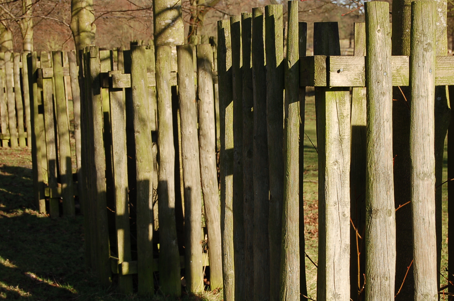 Winter sunlight through Miscanthus and Cornus.Stripes of fence shadows fall across a variegated holly.Blood red dogwood stems.Peeling bark like brittle toffee.Green flowered hellebore with striped shadows.Premature bud burst on Viburnum.Striped snake bark maple.