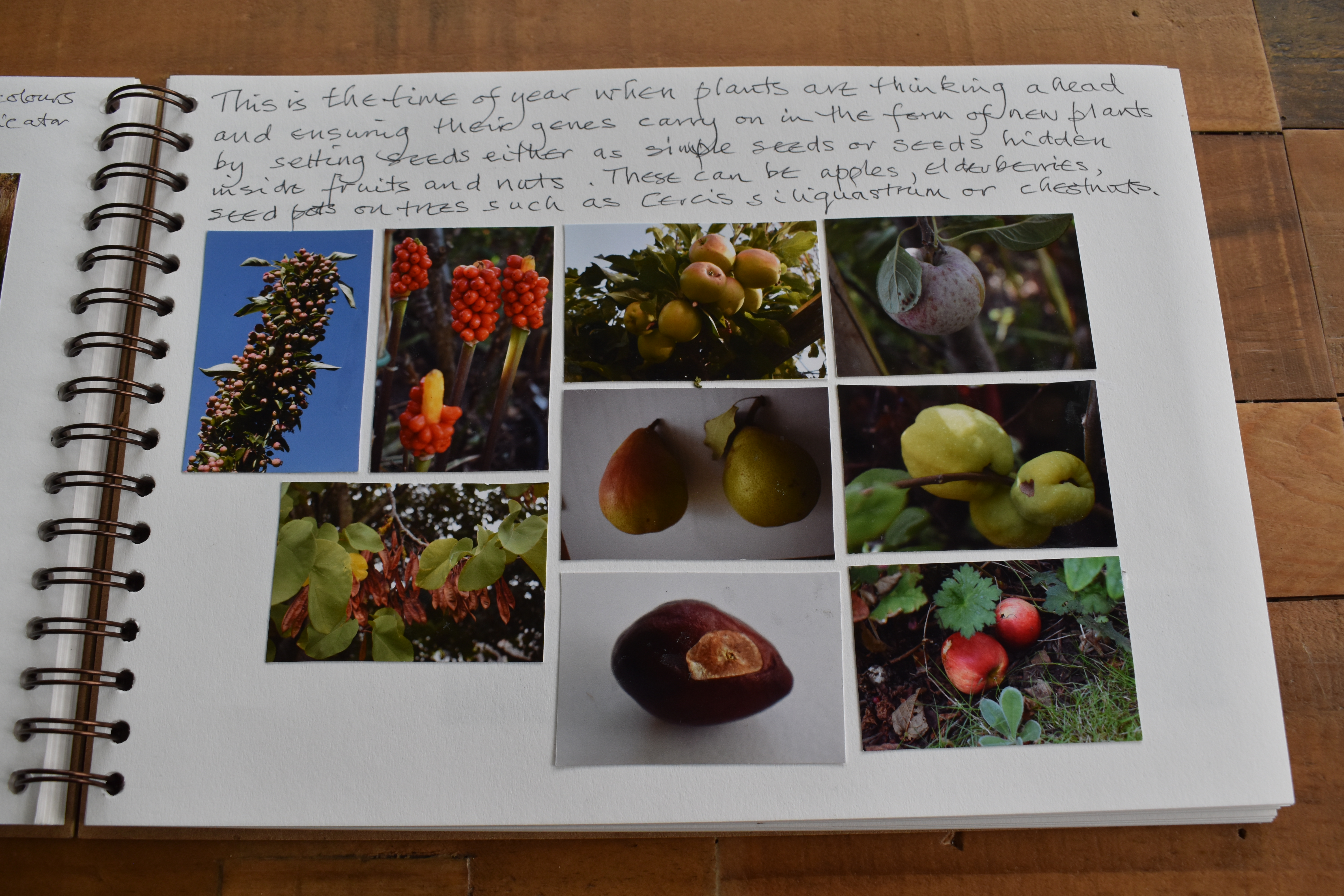 On the next page I featured another autumn happening which we look forward to so much even though it is a busy time for a while. “This is the time of year when plants are thinking ahead and ensuring their genes carry on in the form of new plants by setting seeds either as simple seeds or as seeds hidden inside fruits or nuts. These can be apples, elderberries or seed pods on trees such as Cercis siliquastrum or chestnuts.”