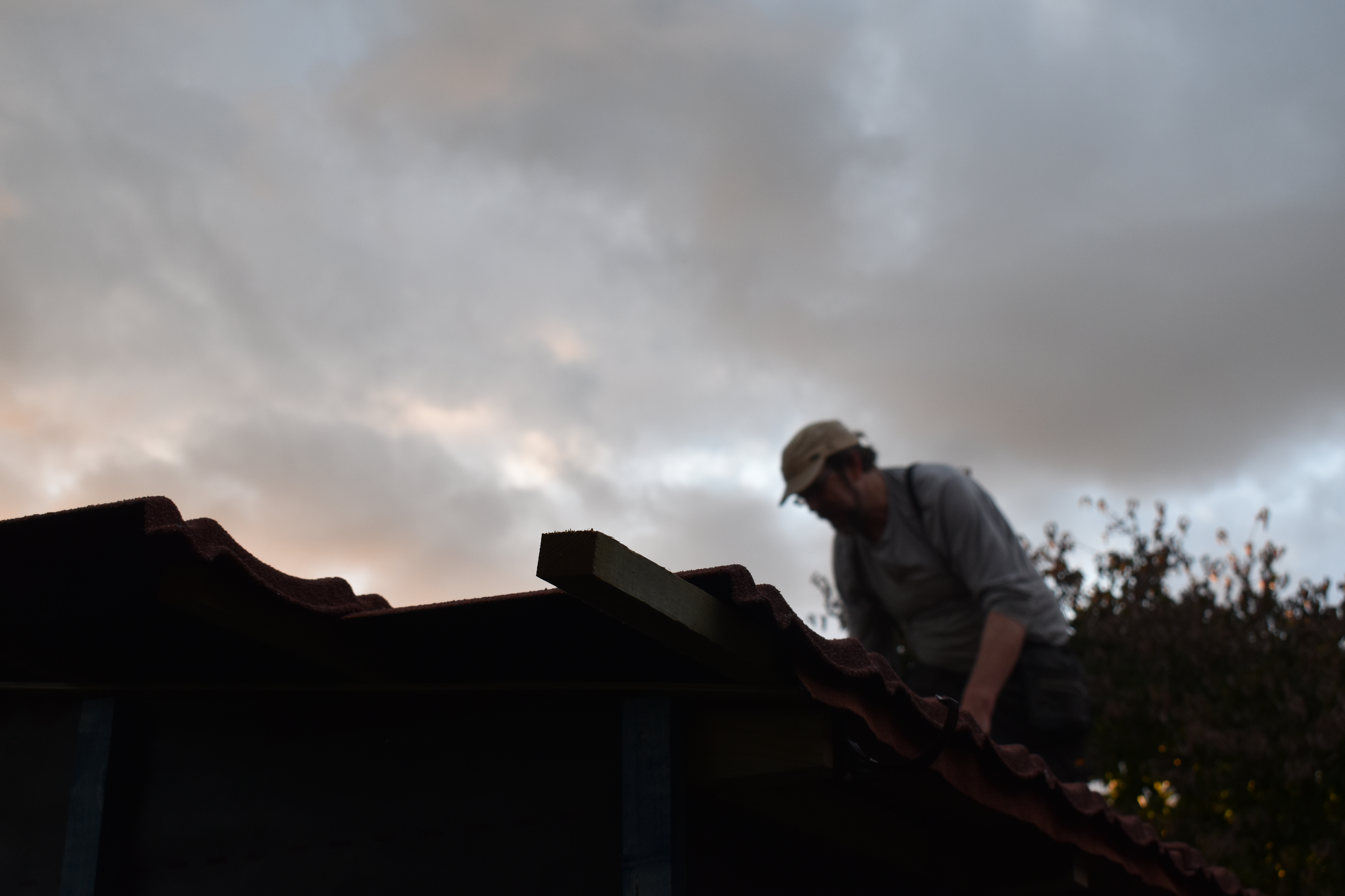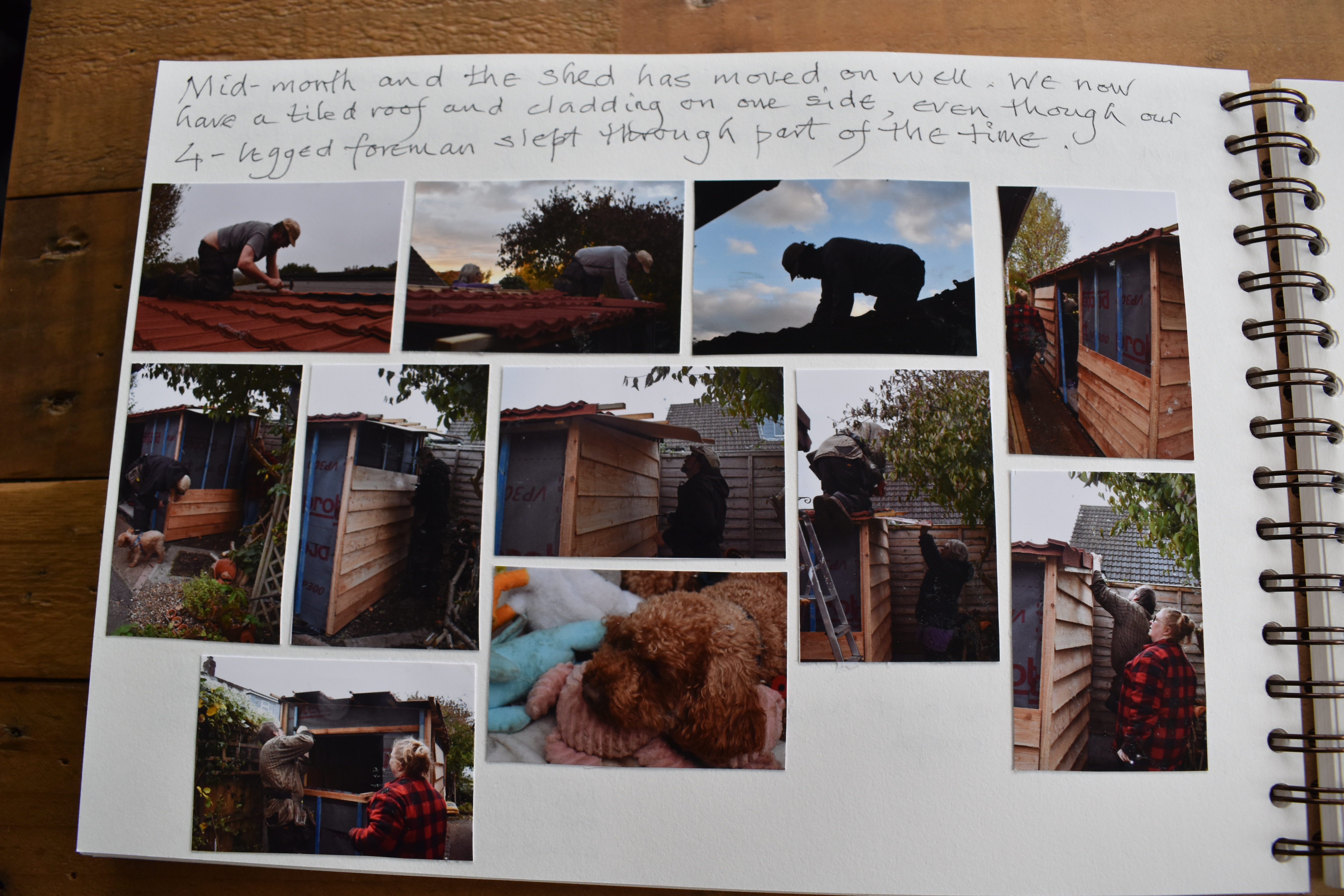 The final page for October showed how our shed was progressing. Here I wrote, “Mid-month and the shed has moved on well. We now have a recycled tile roof and part of the cladding fixed to the outside, even though our four-legged foreman slept through part of the time.”