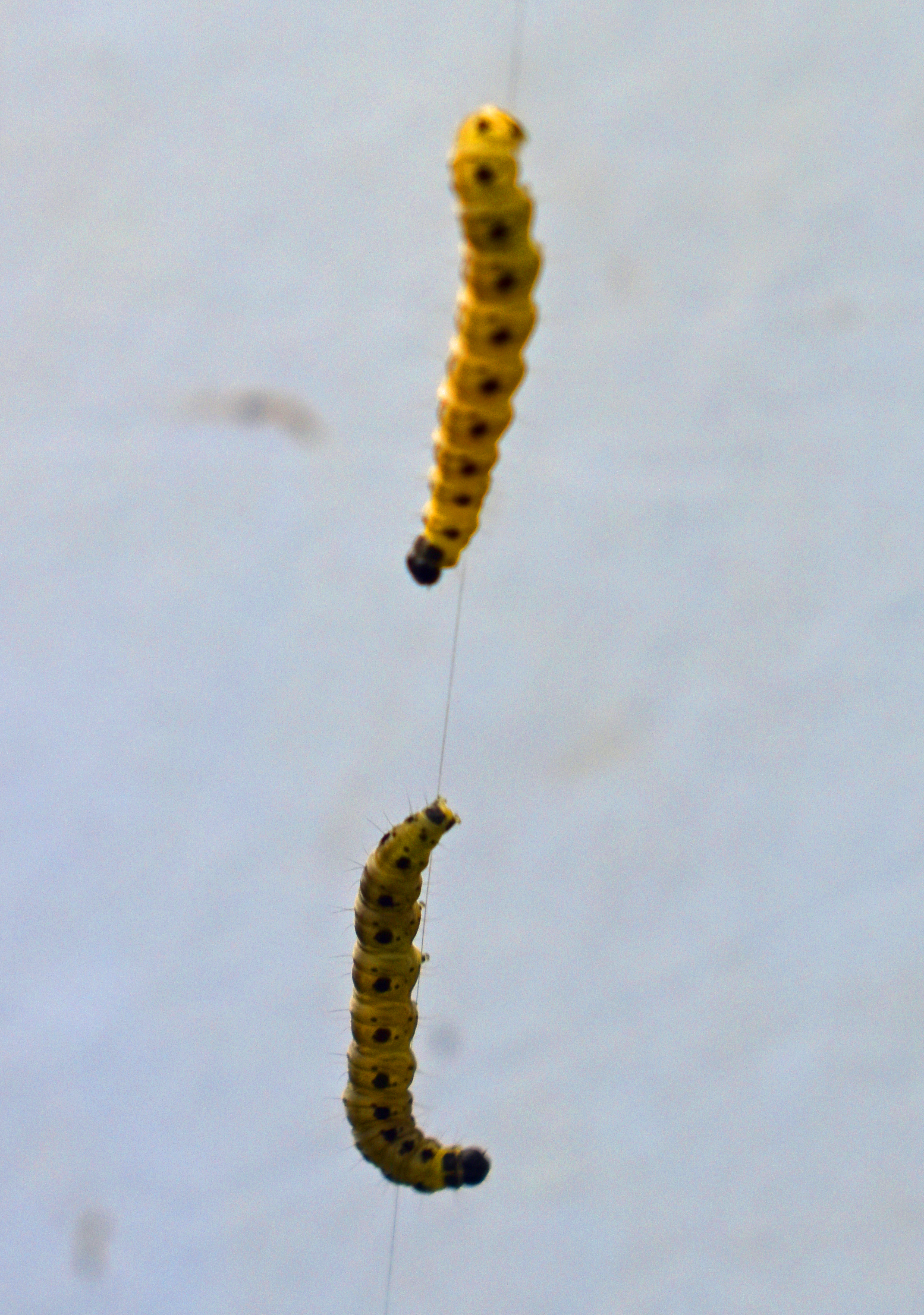 The two photos below show a ladybird larva and caterpillars on silk threads.