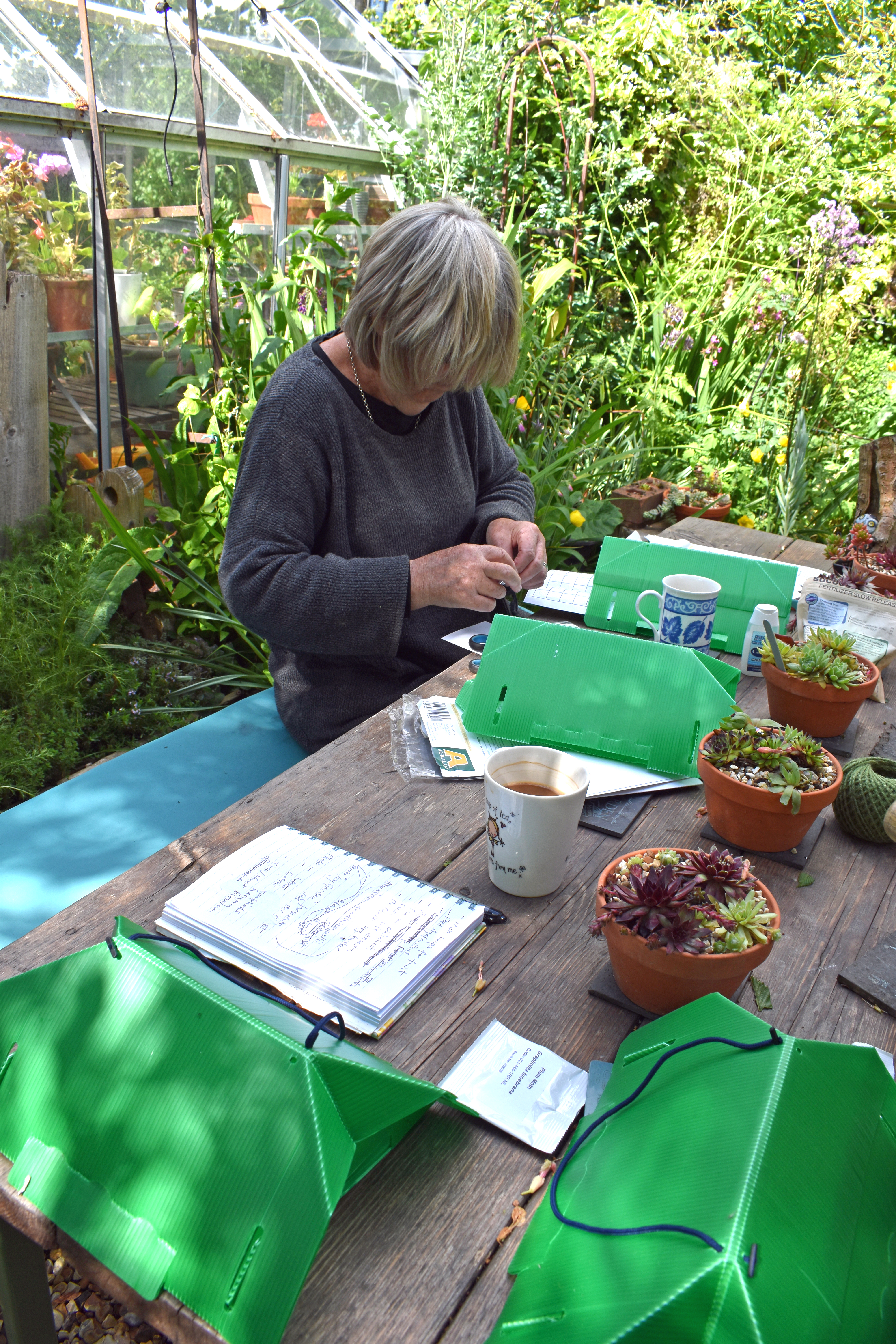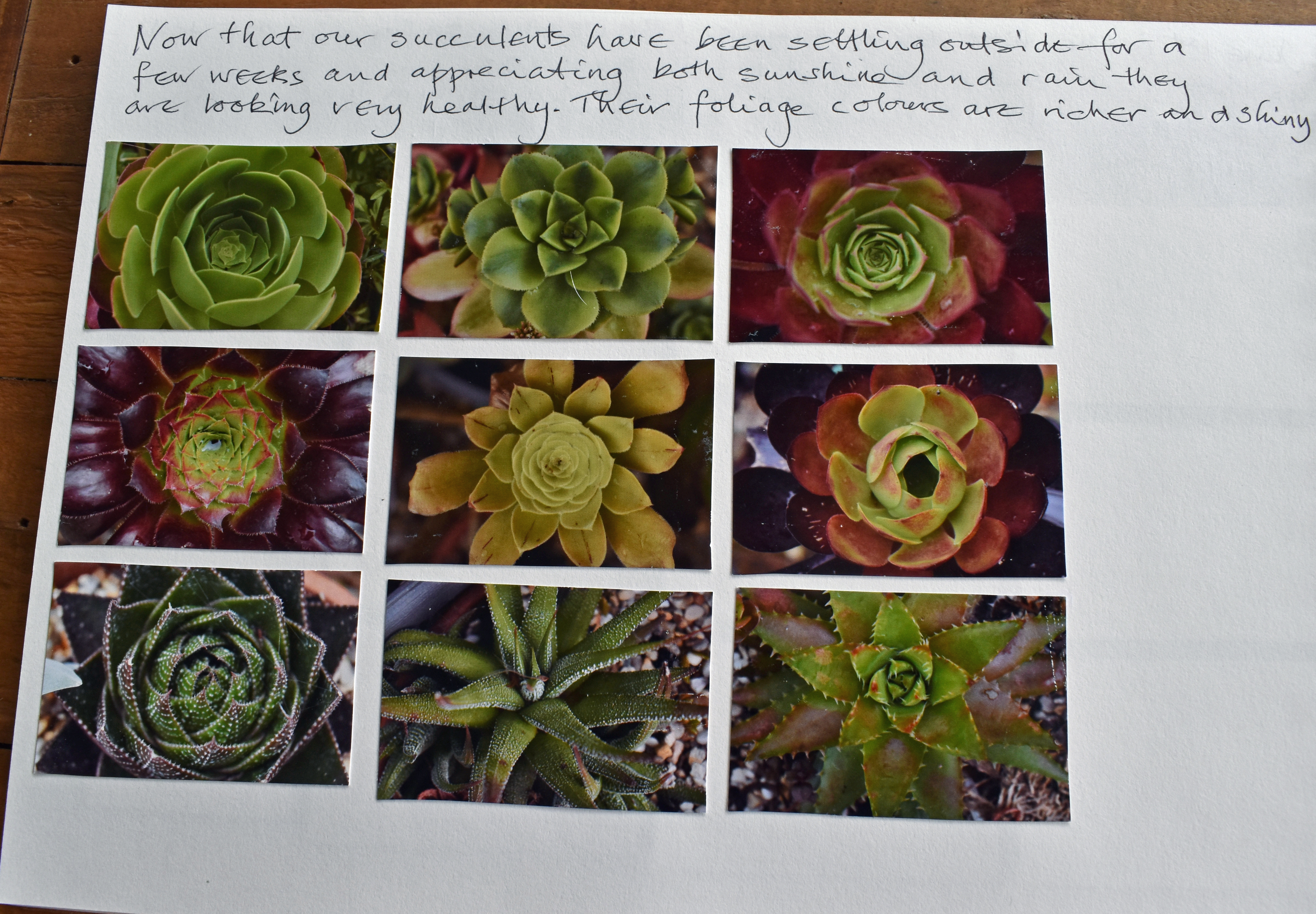 Over the page and we move on from roses to a completely different type of plant, the succulent family. I carried on by saying, “Now that our succulents have been settling outside for a few weeks and appreciating both sunshine and rain they are looking very healthy. Their foliage colours are now richer and shiny.”