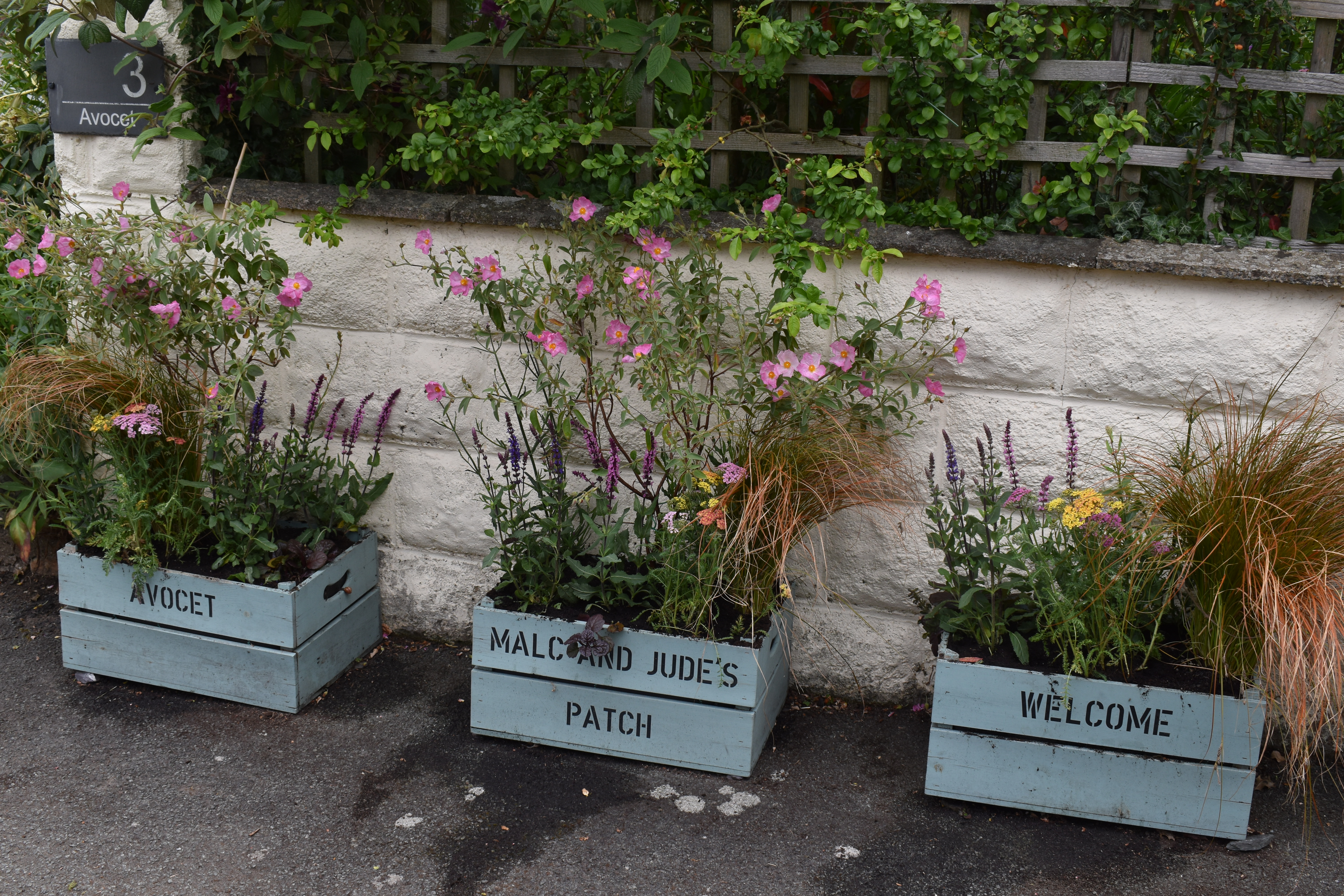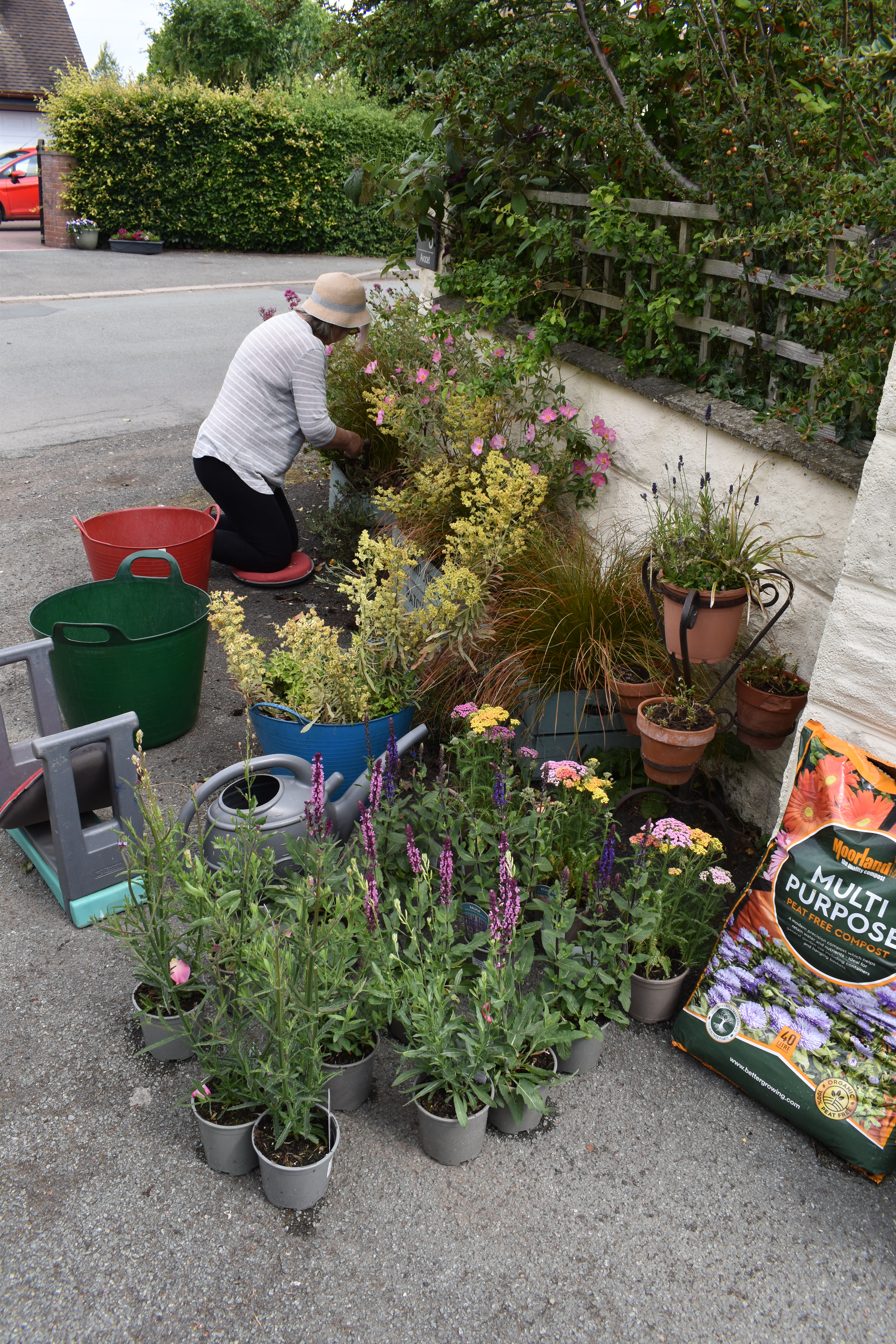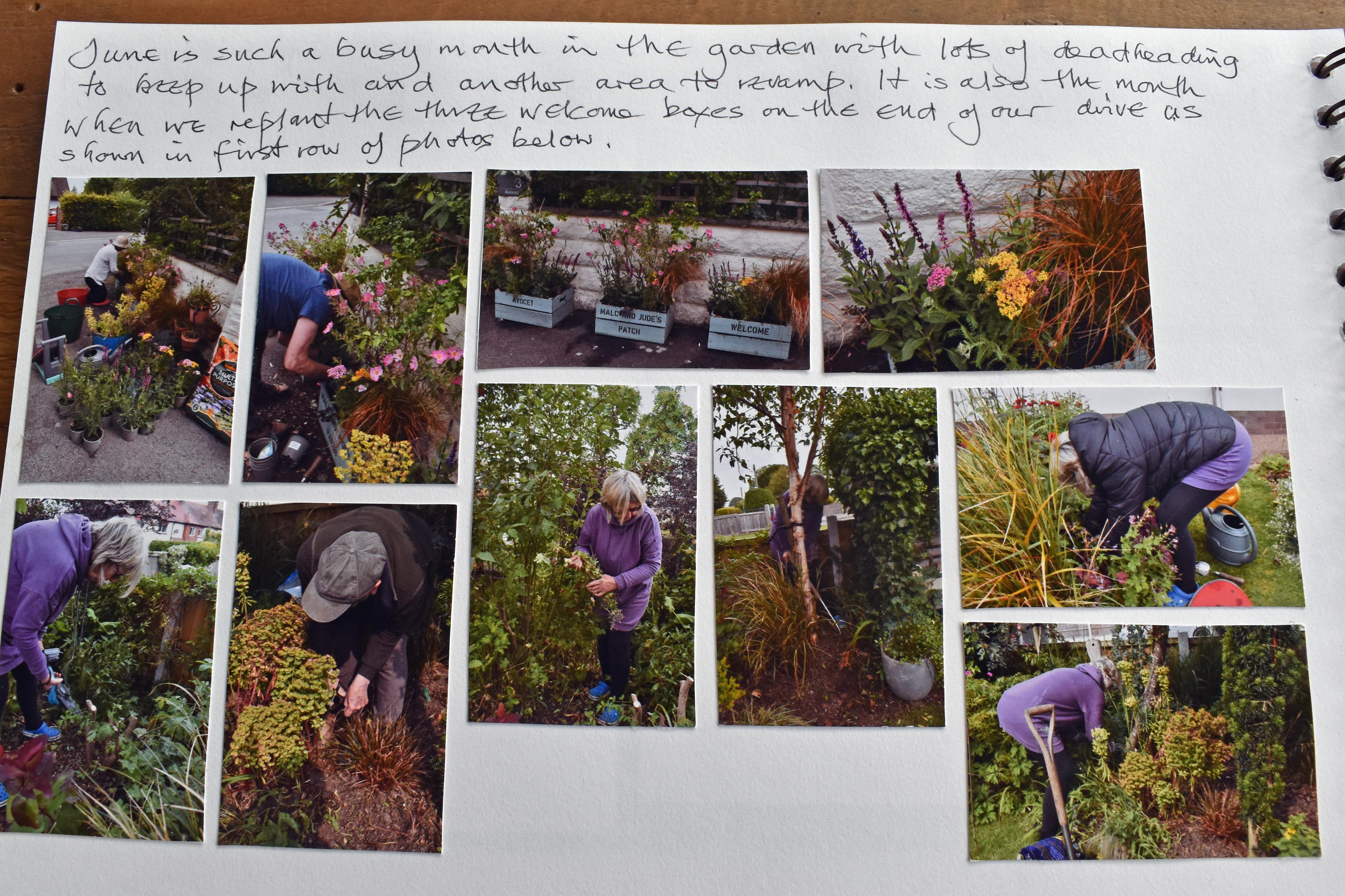 This is what I wrote to introduce the page of photos. “June is such a busy month in the garden with lots of deadheading to keep up with and another area to revamp. It is also the month when we replant the three welcome boxes on the end of our drive as shown in the top line of photos below.”