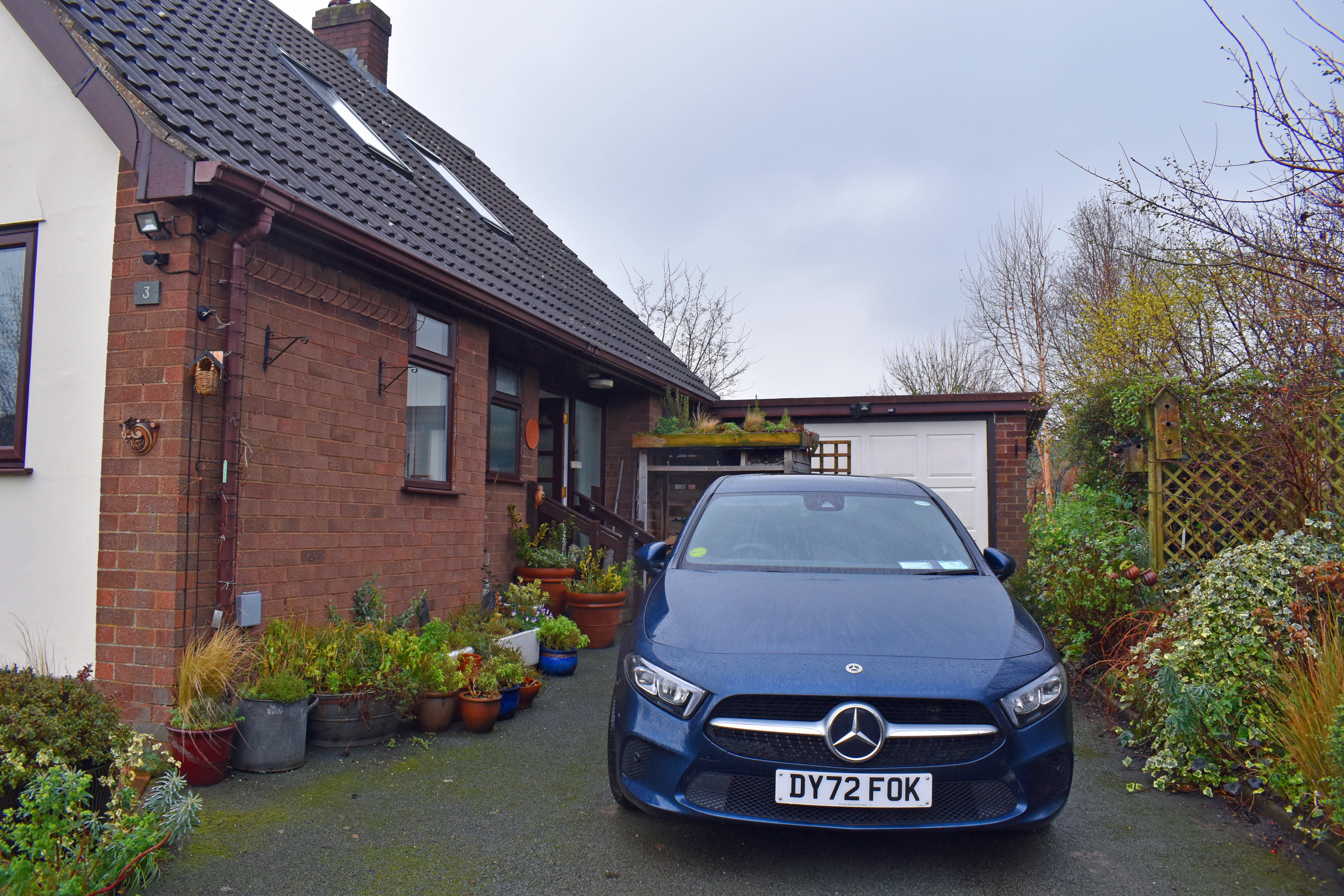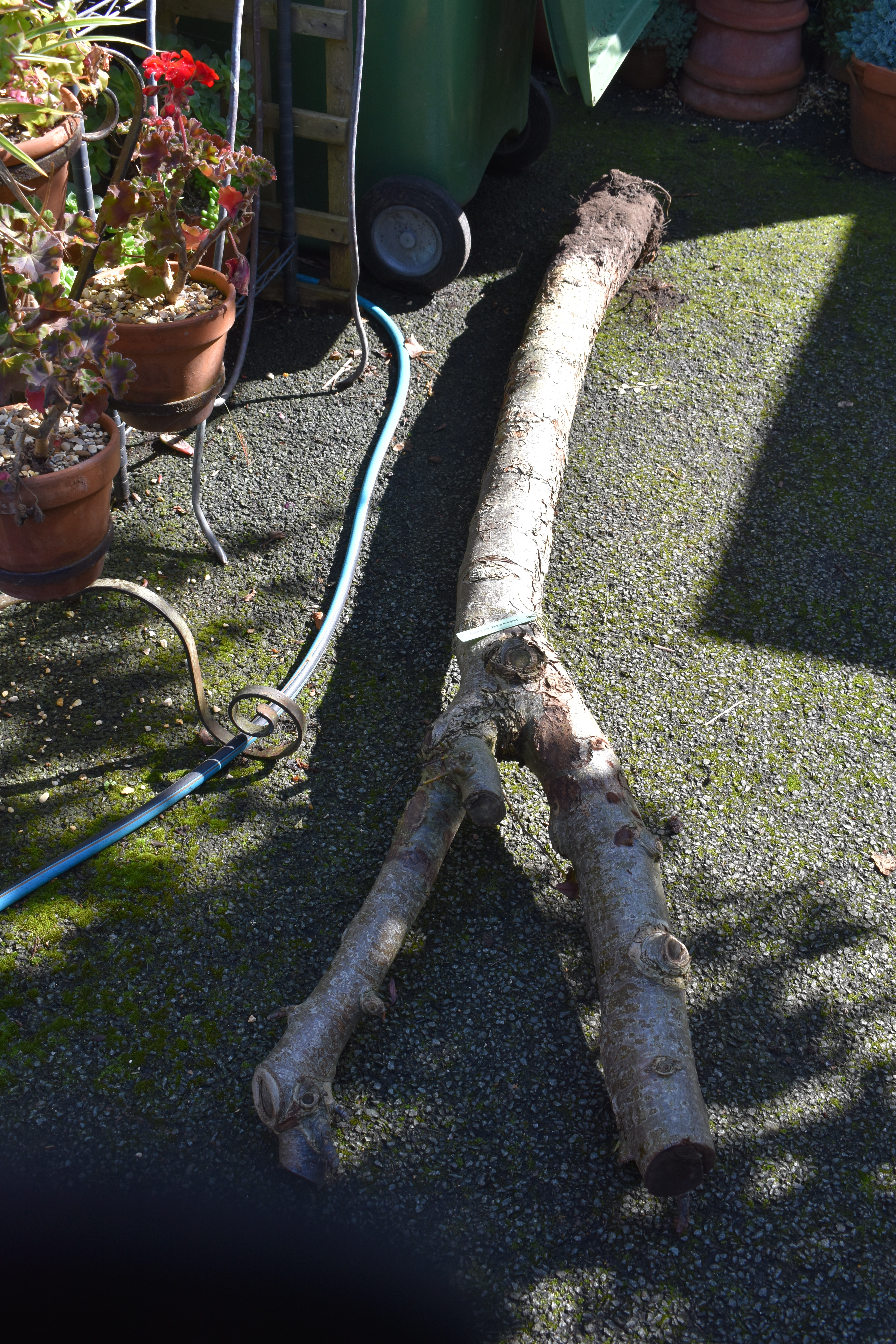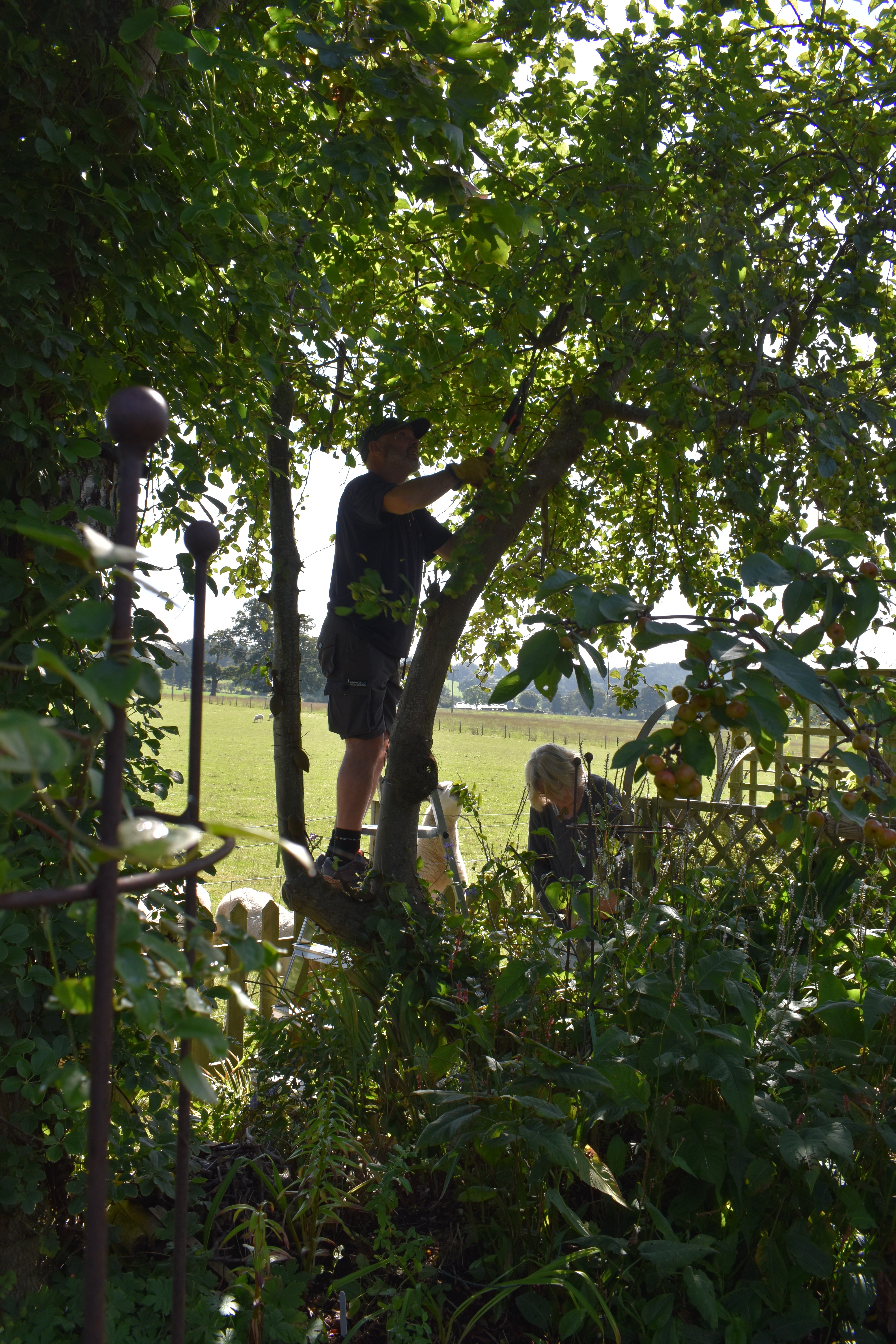 Replacing a rotten tree stake, trying to rid the drive of algae and tying in this year’s blackberry boughs.