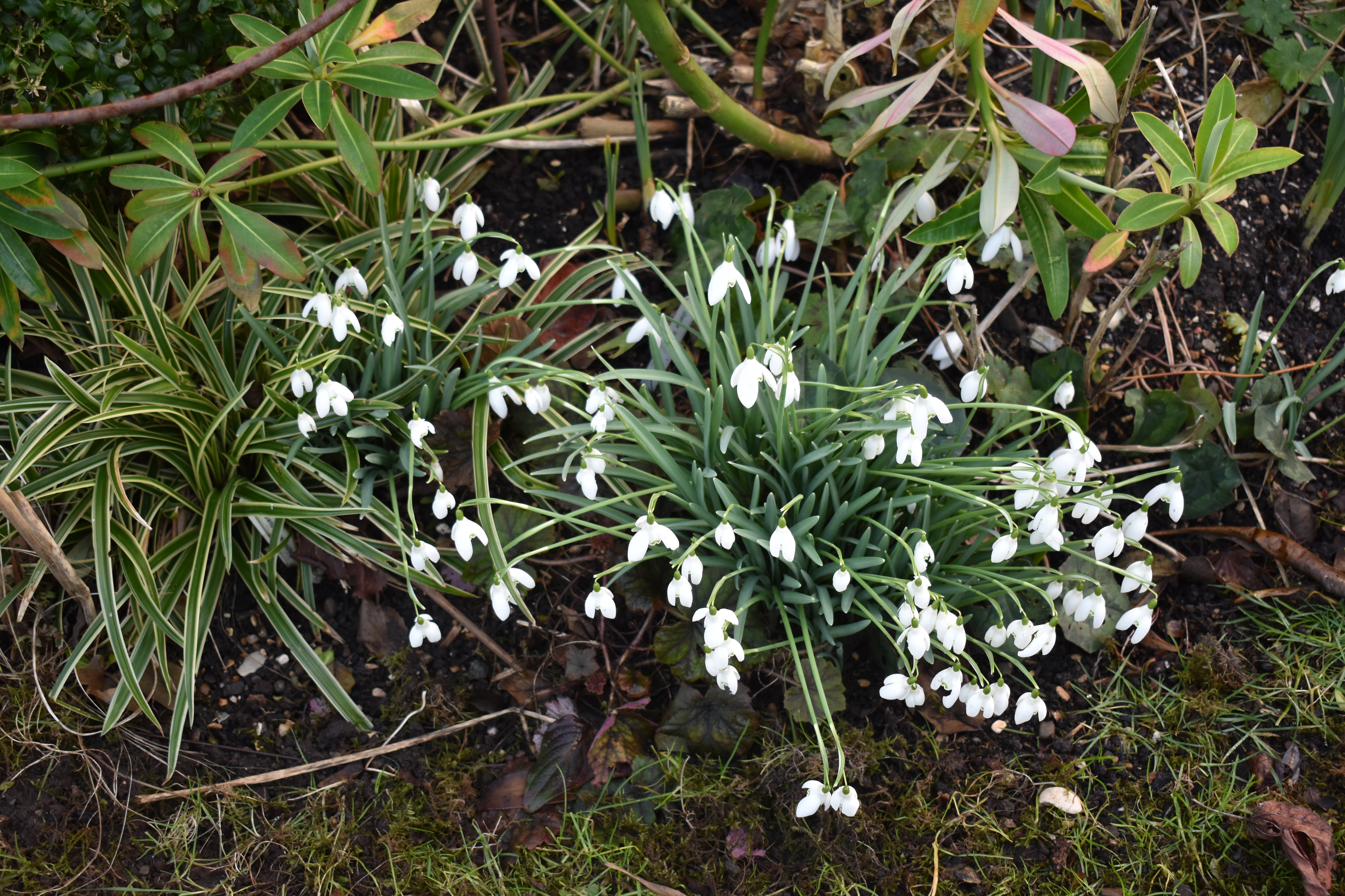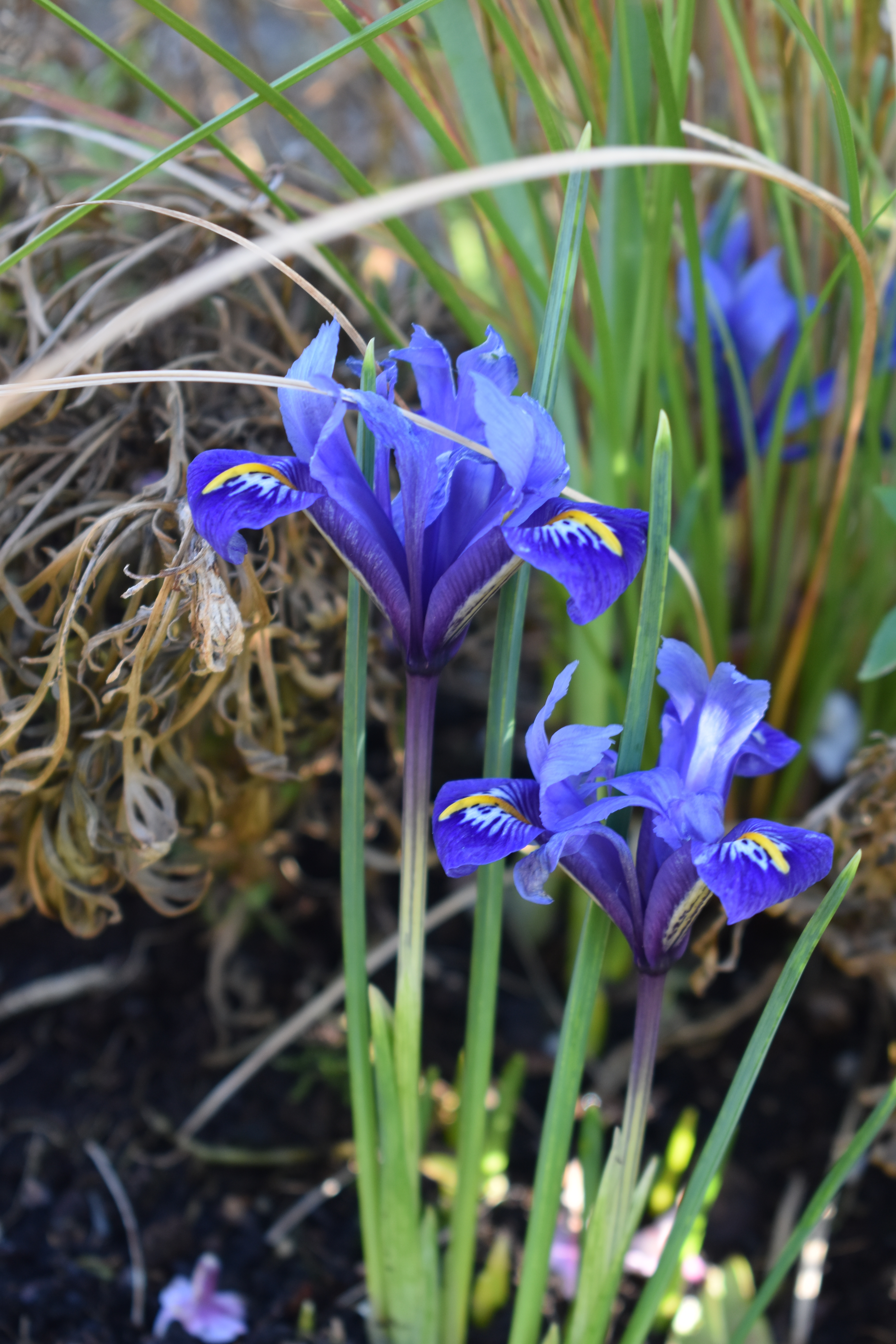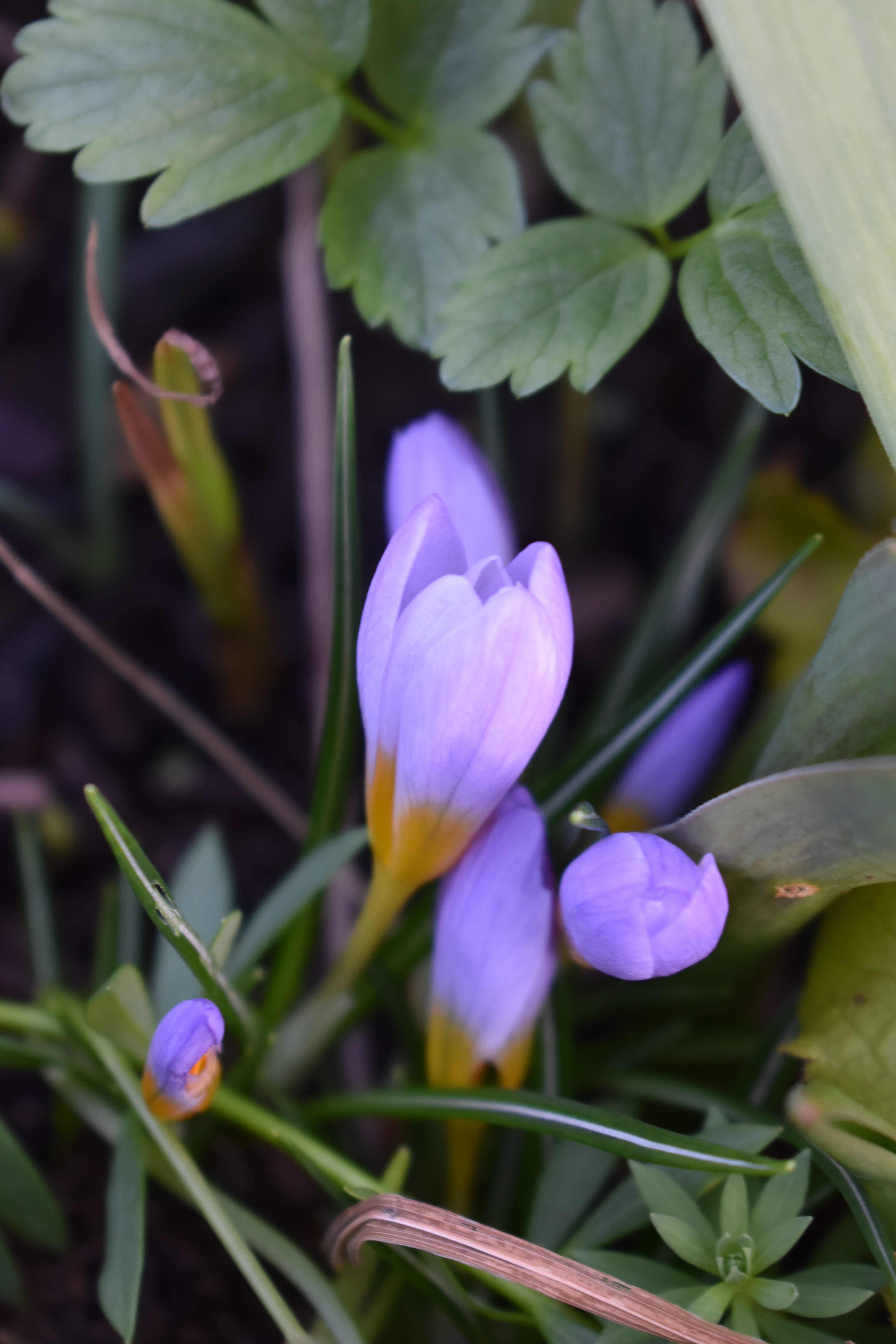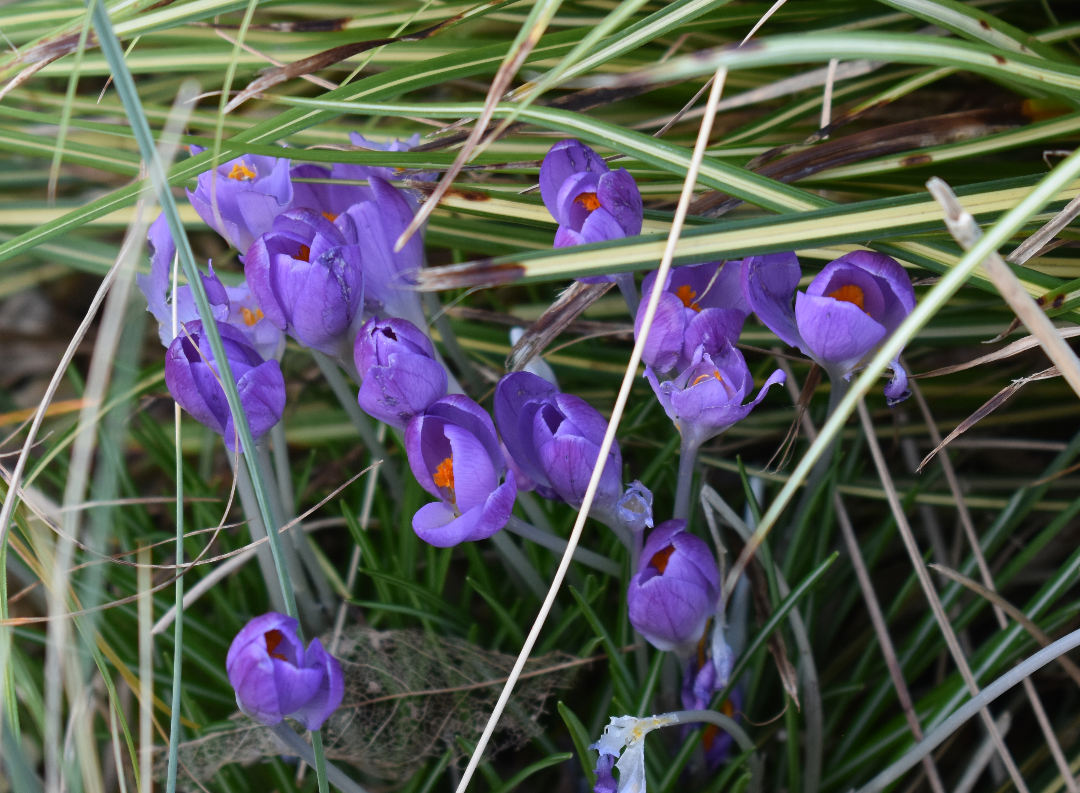 Below a set of four photos I wrote, “Winter flowering bulbs and perennials add shots of colour close to ground level. Crocosmia show off their fresh bright green shoots. Our Calamagrostis and other grasses have new shoots too.”