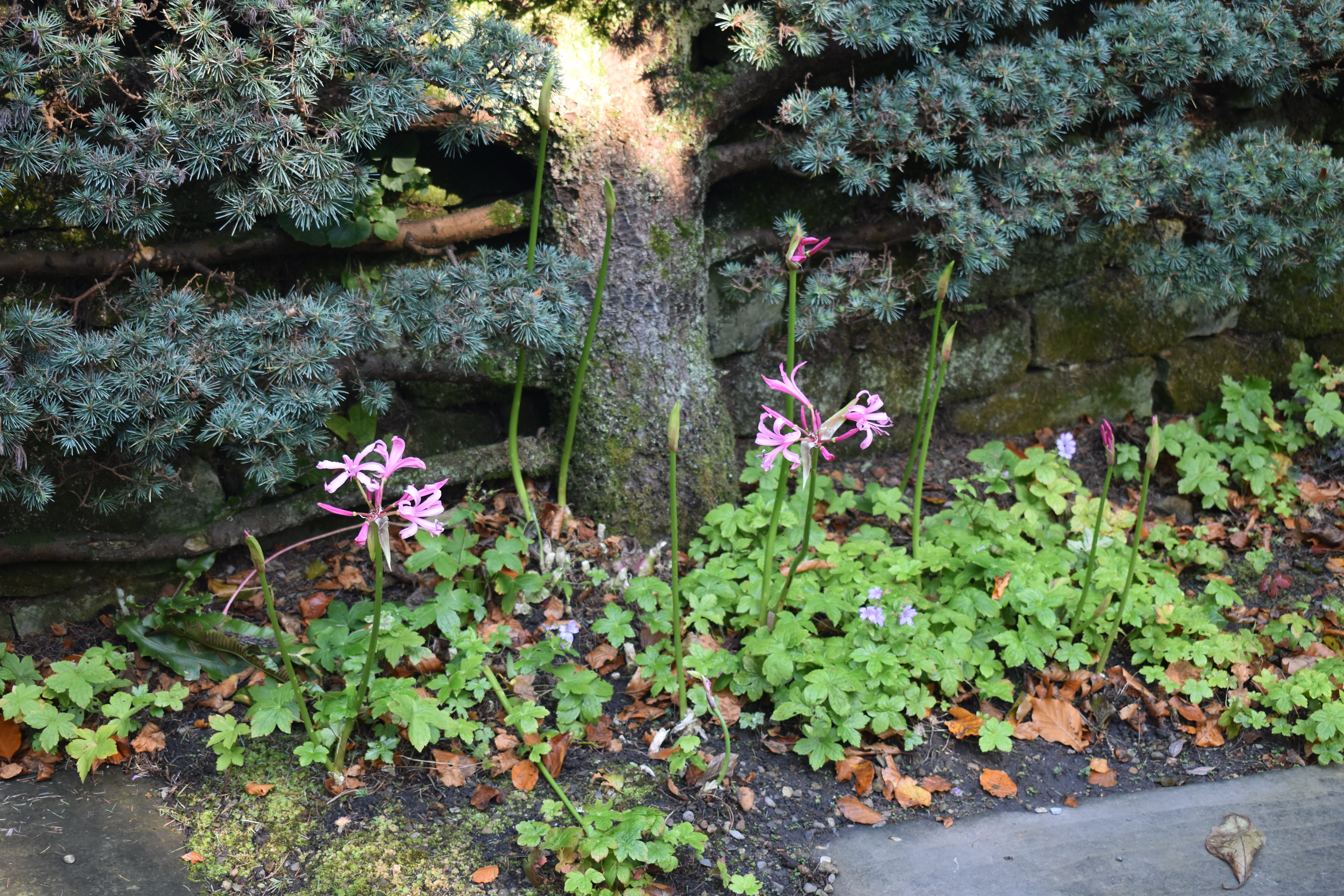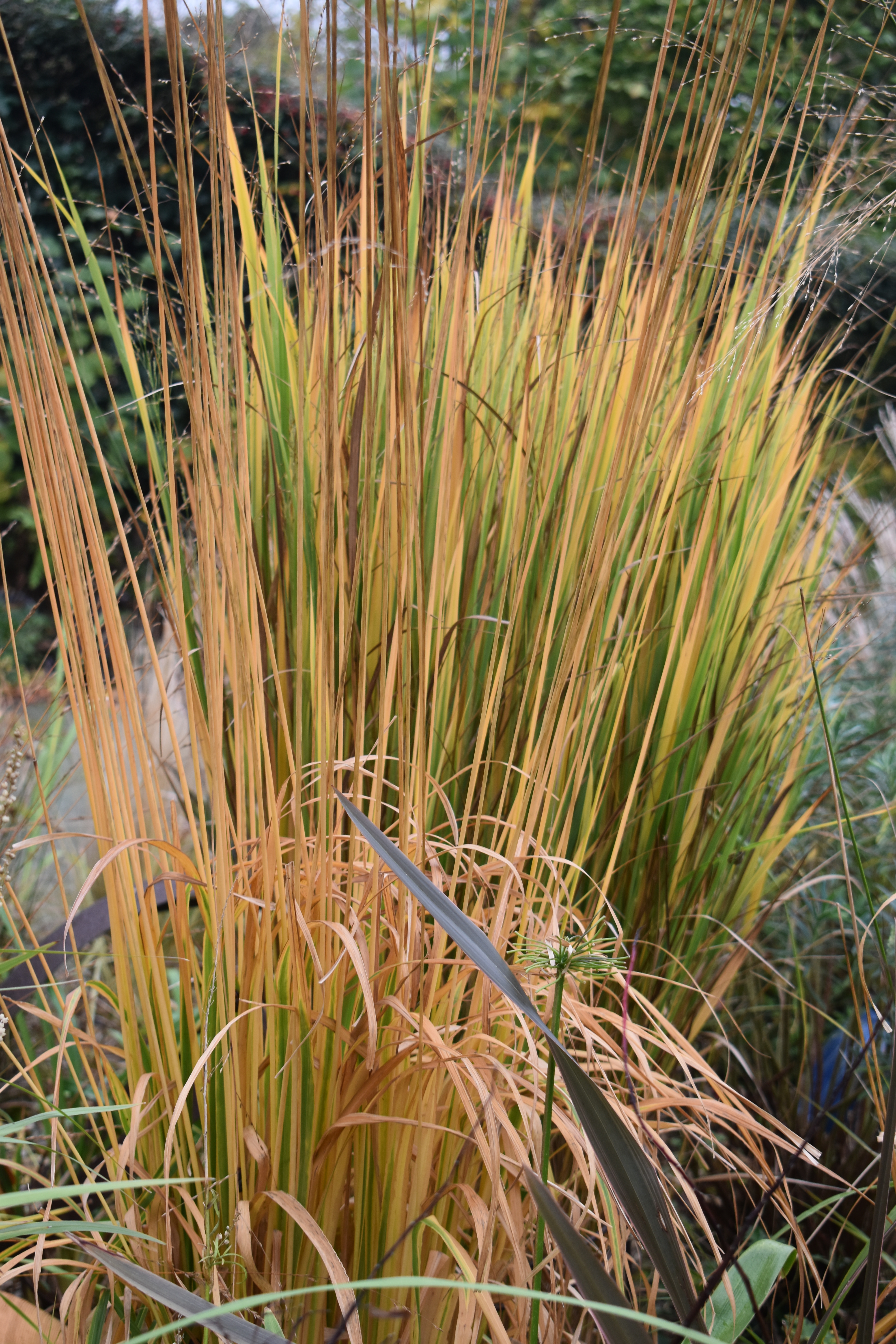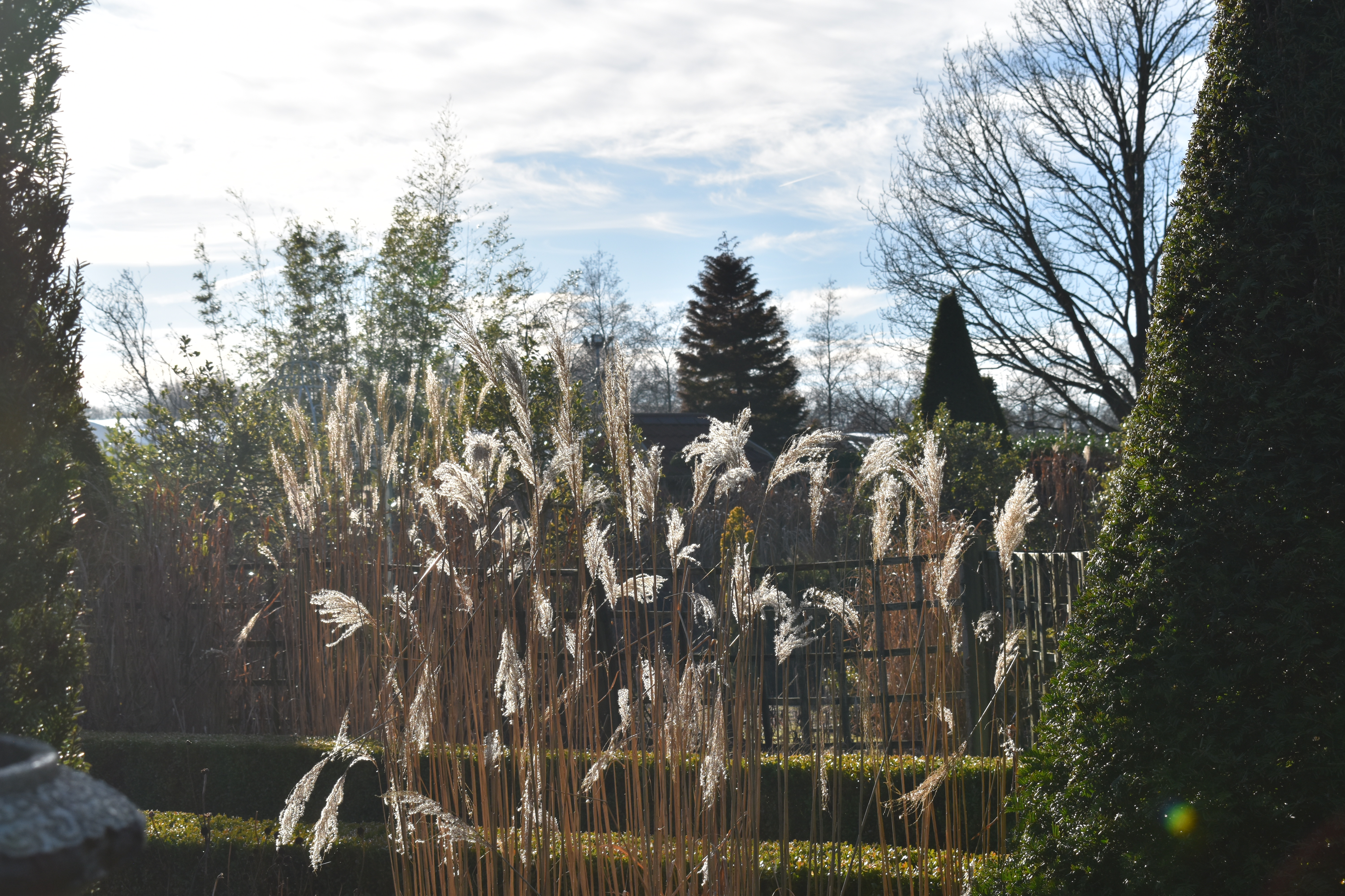 Below a set of four photos I wrote, “Winter flowering bulbs and perennials add shots of colour close to ground level. Crocosmia show off their fresh bright green shoots. Our Calamagrostis and other grasses have new shoots too.”
