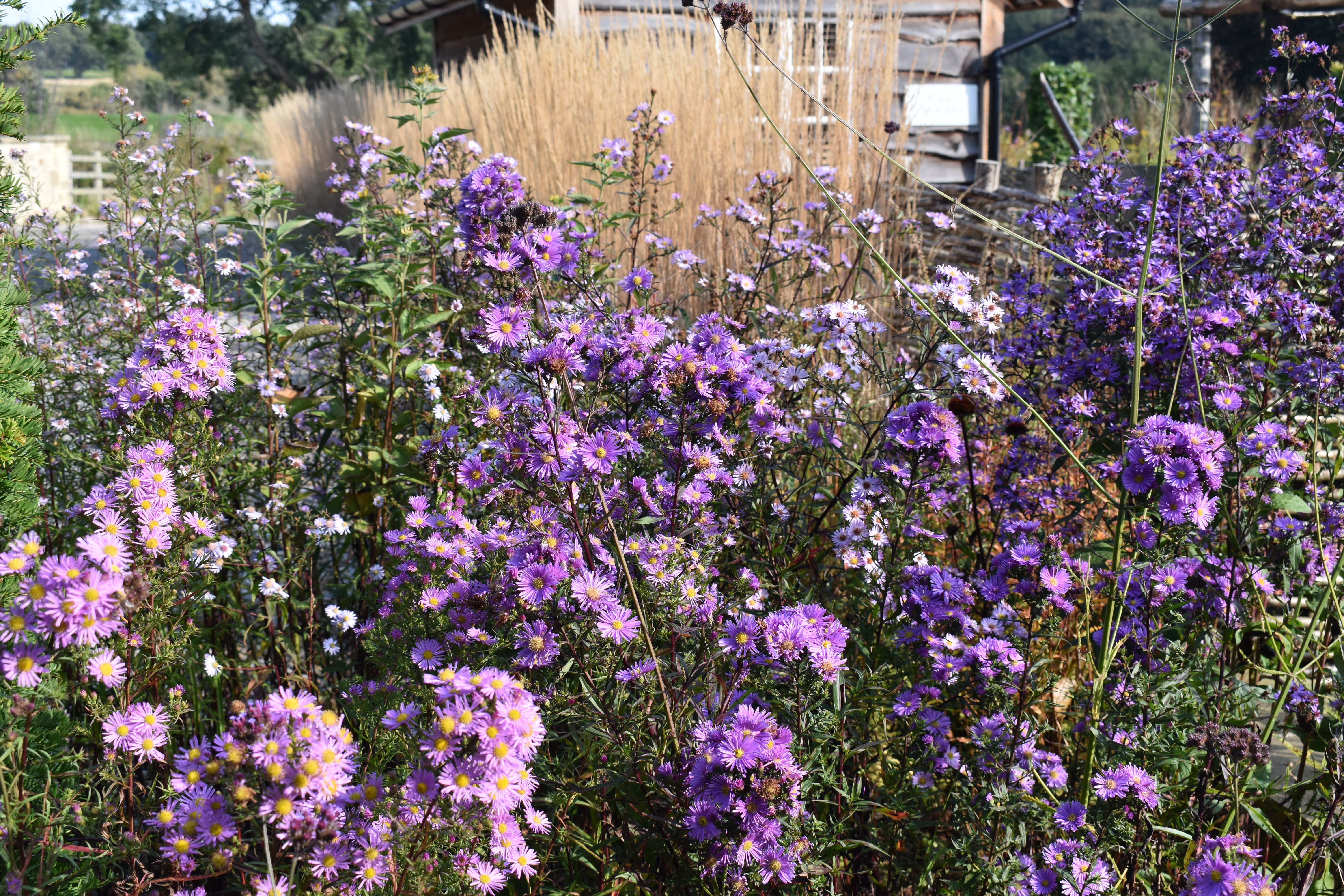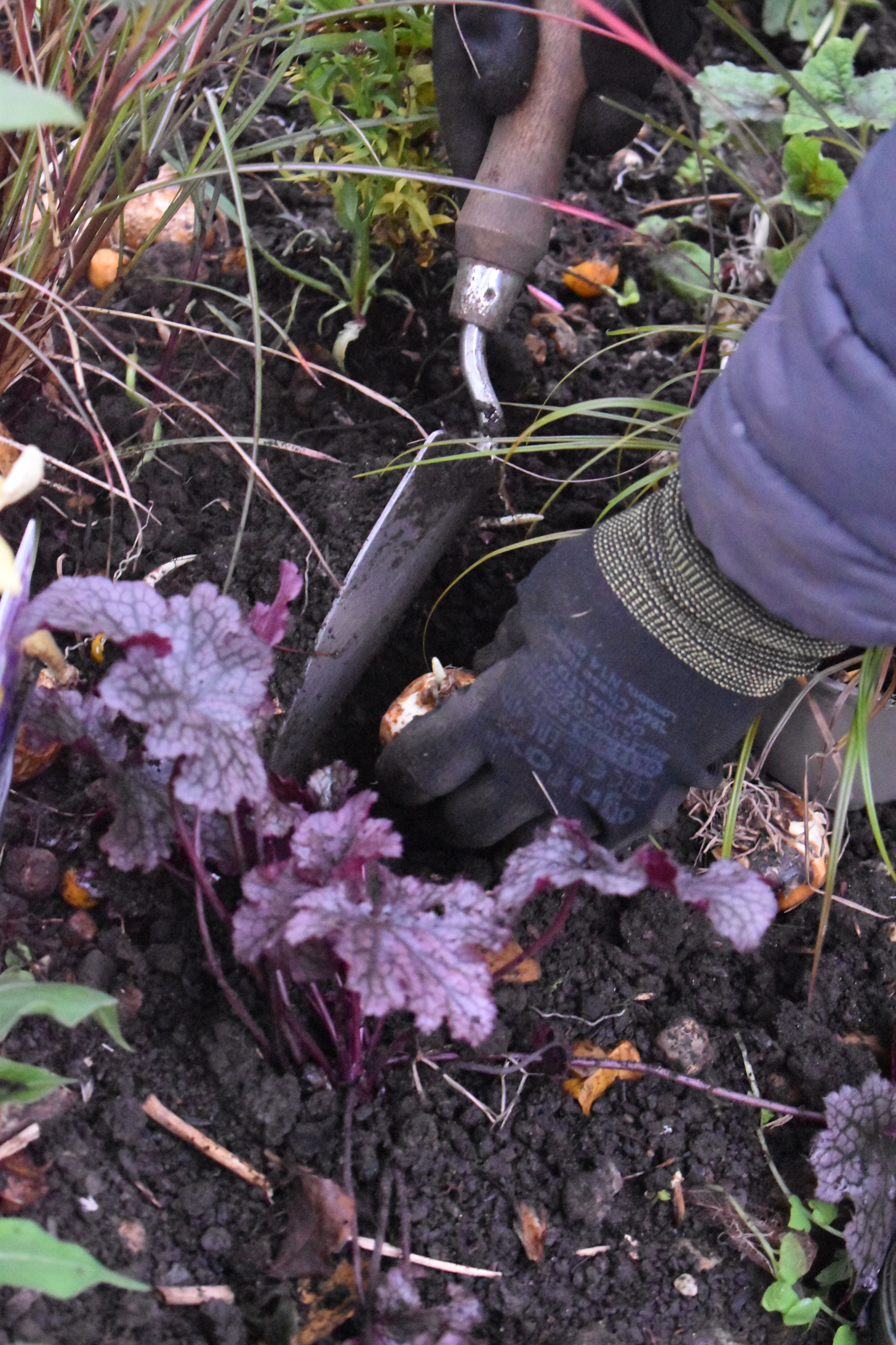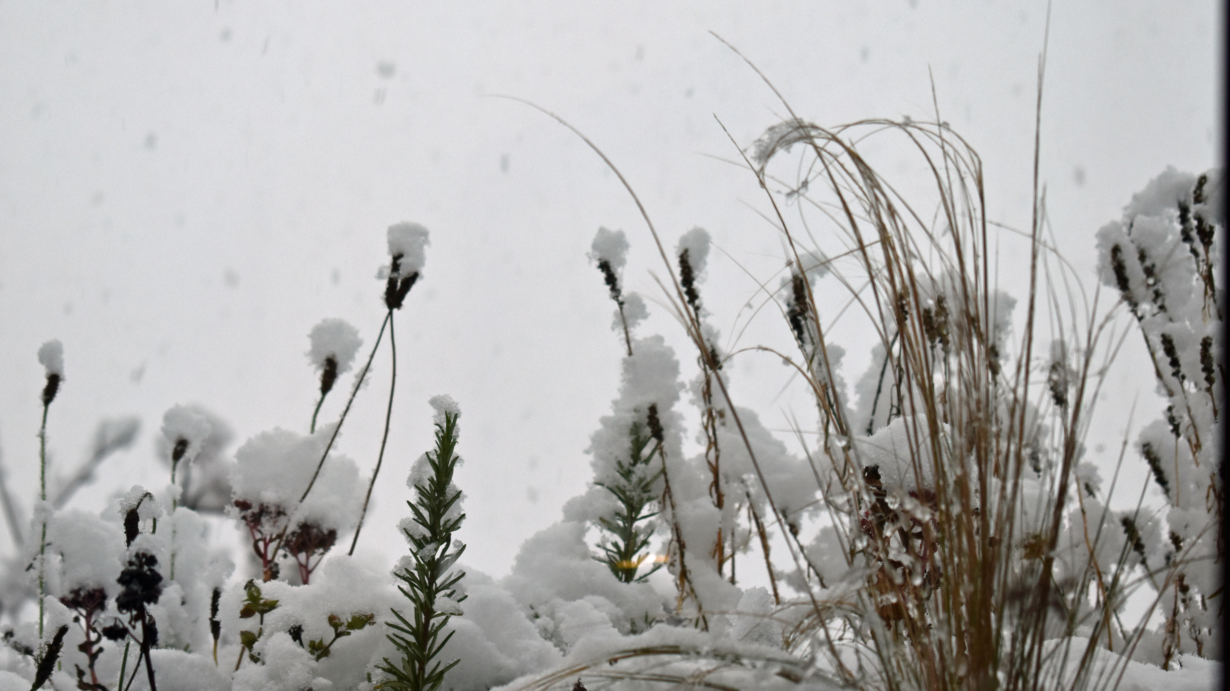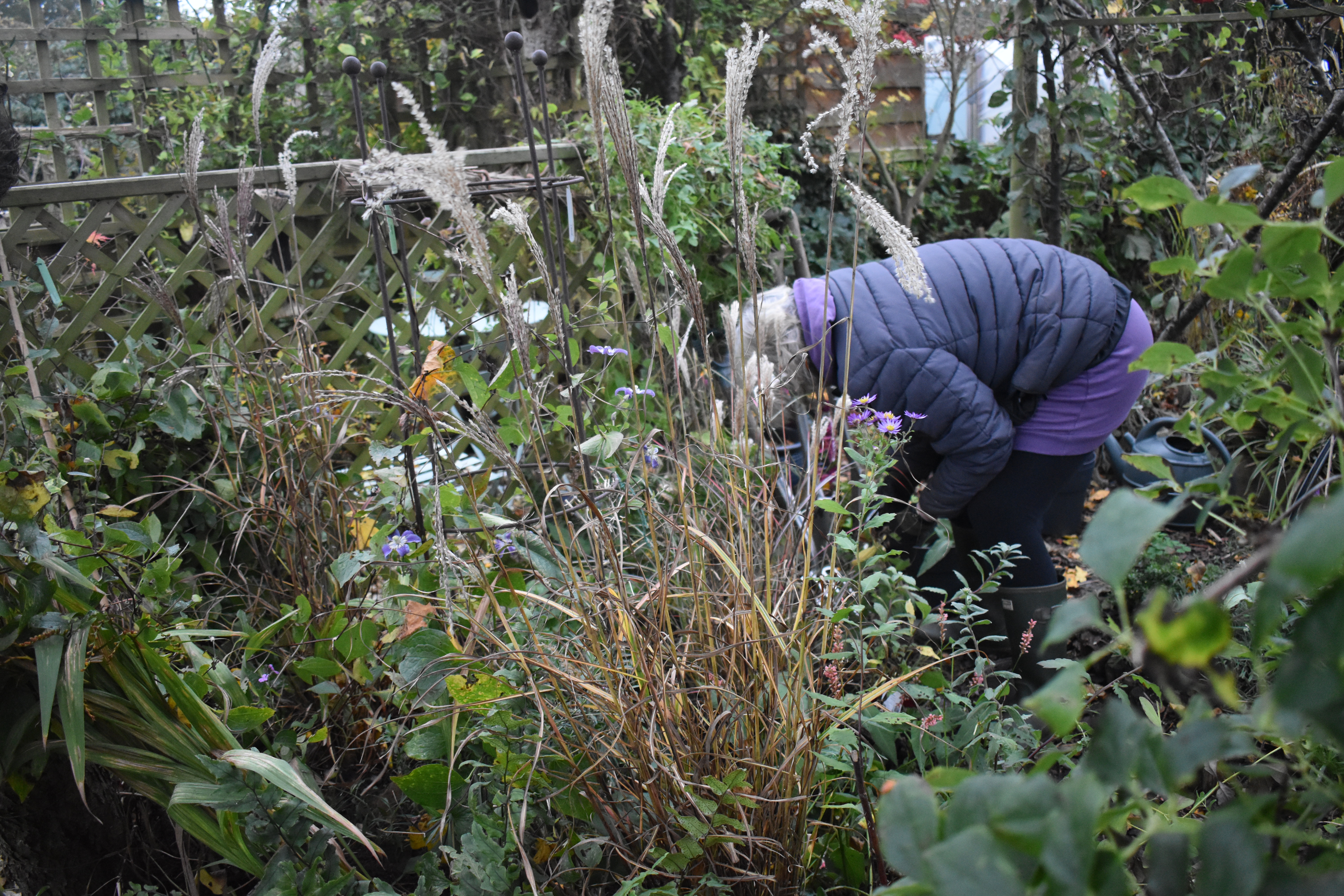 Below a set of four photos I wrote, “Winter flowering bulbs and perennials add shots of colour close to ground level. Crocosmia show off their fresh bright green shoots. Our Calamagrostis and other grasses have new shoots too.”
