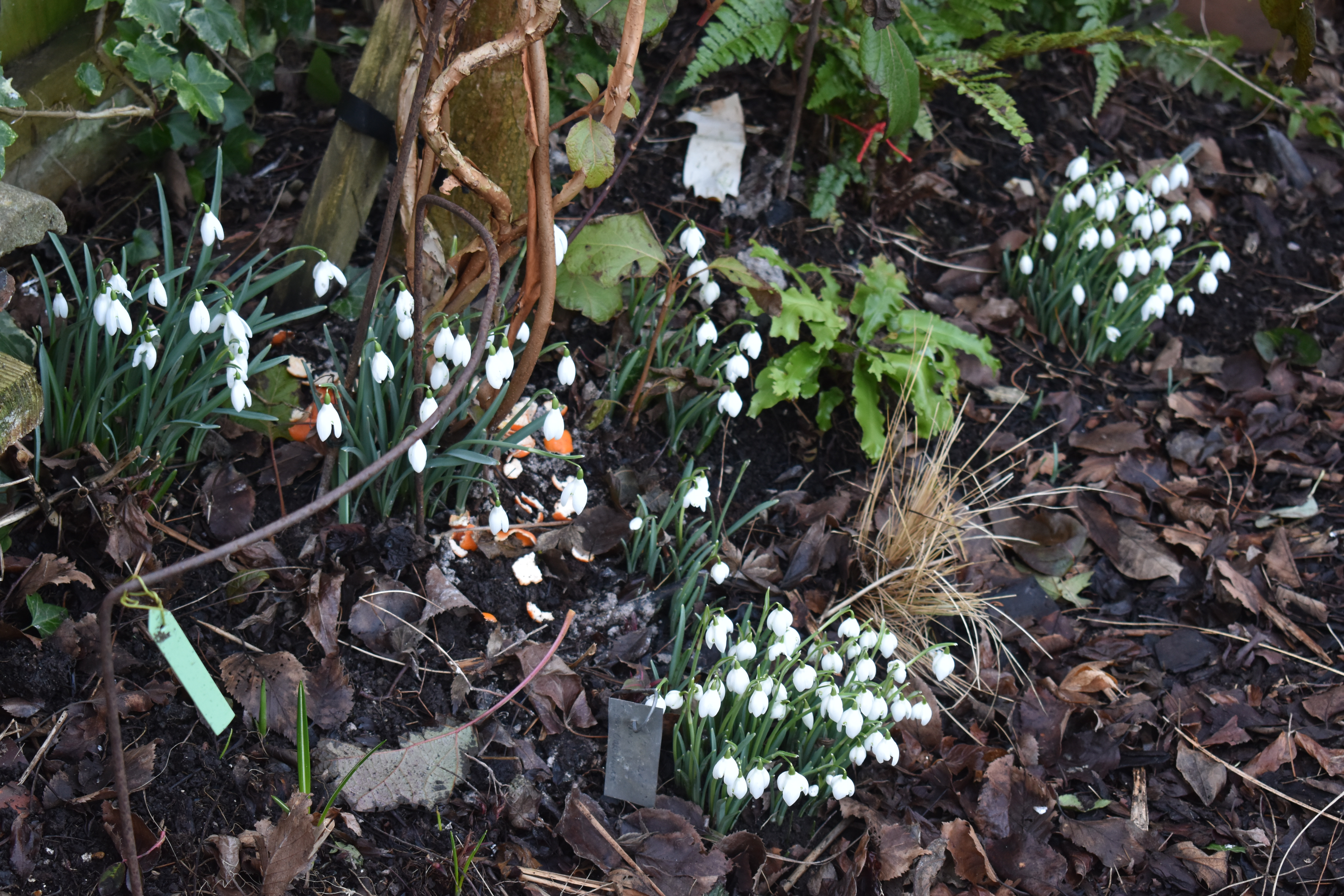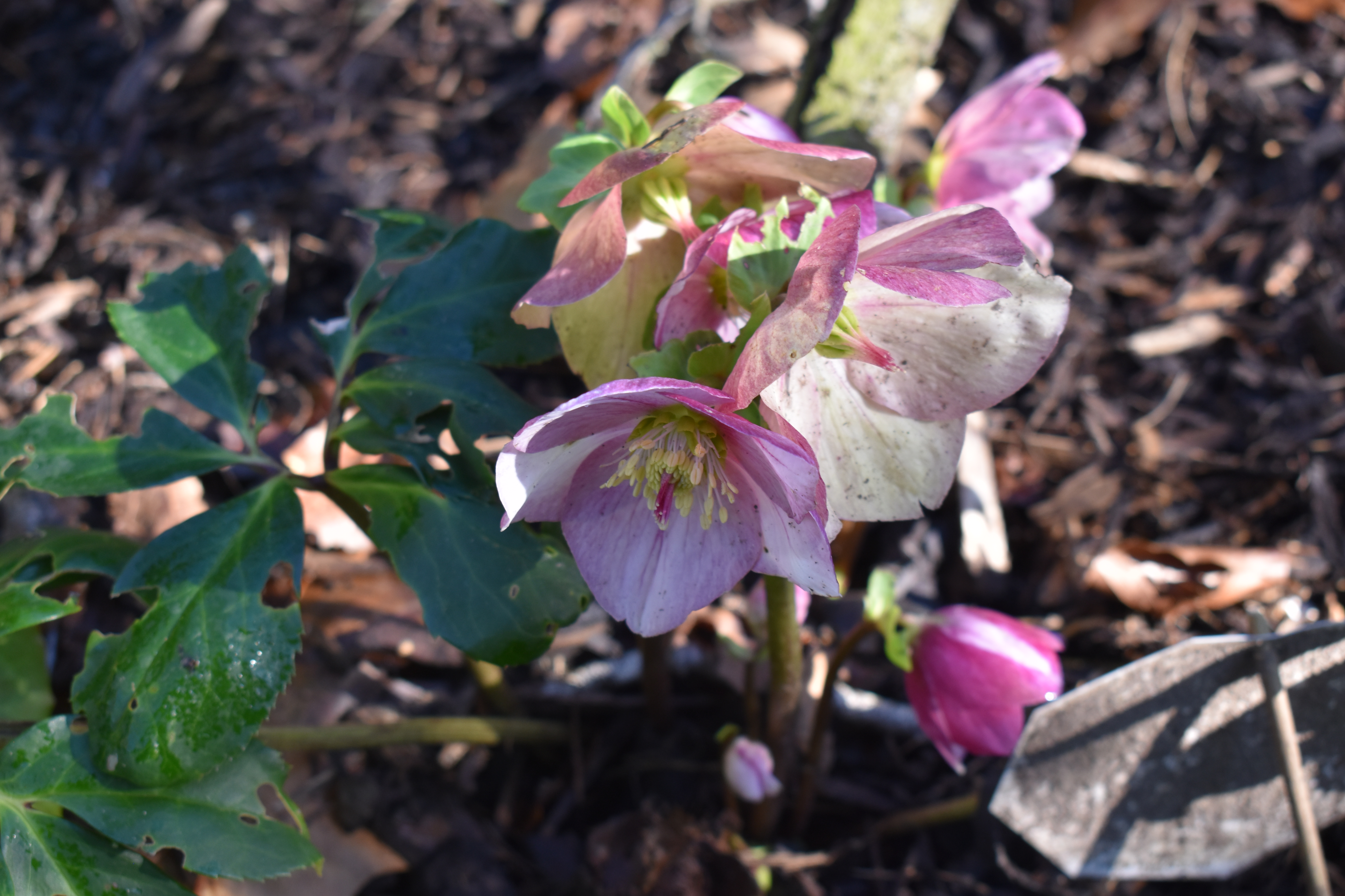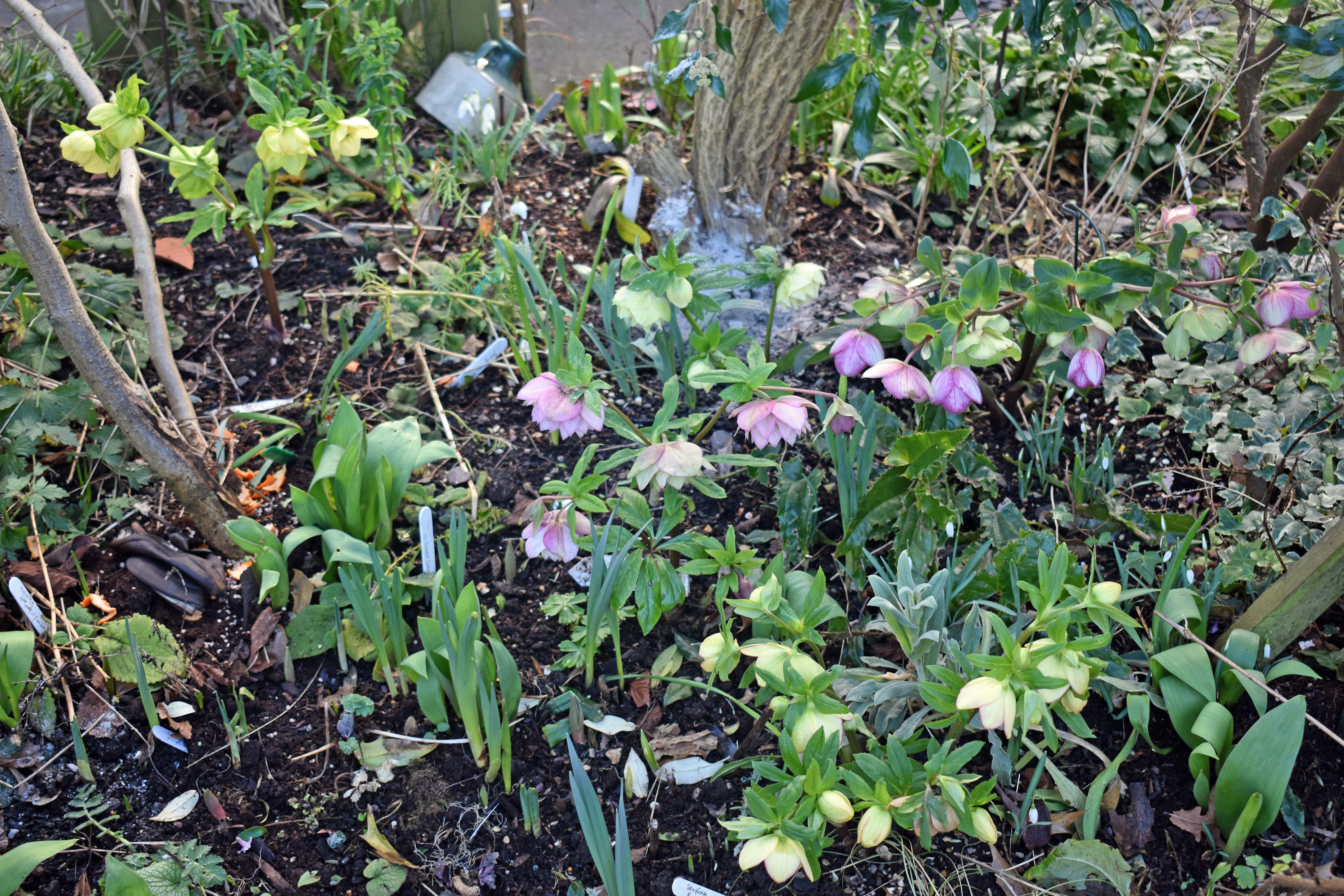 “Eranthis hyemalis also known as Winter Aconite with emerging crocosmias.” A mix of our hellebores in our ‘Winter Border’.”