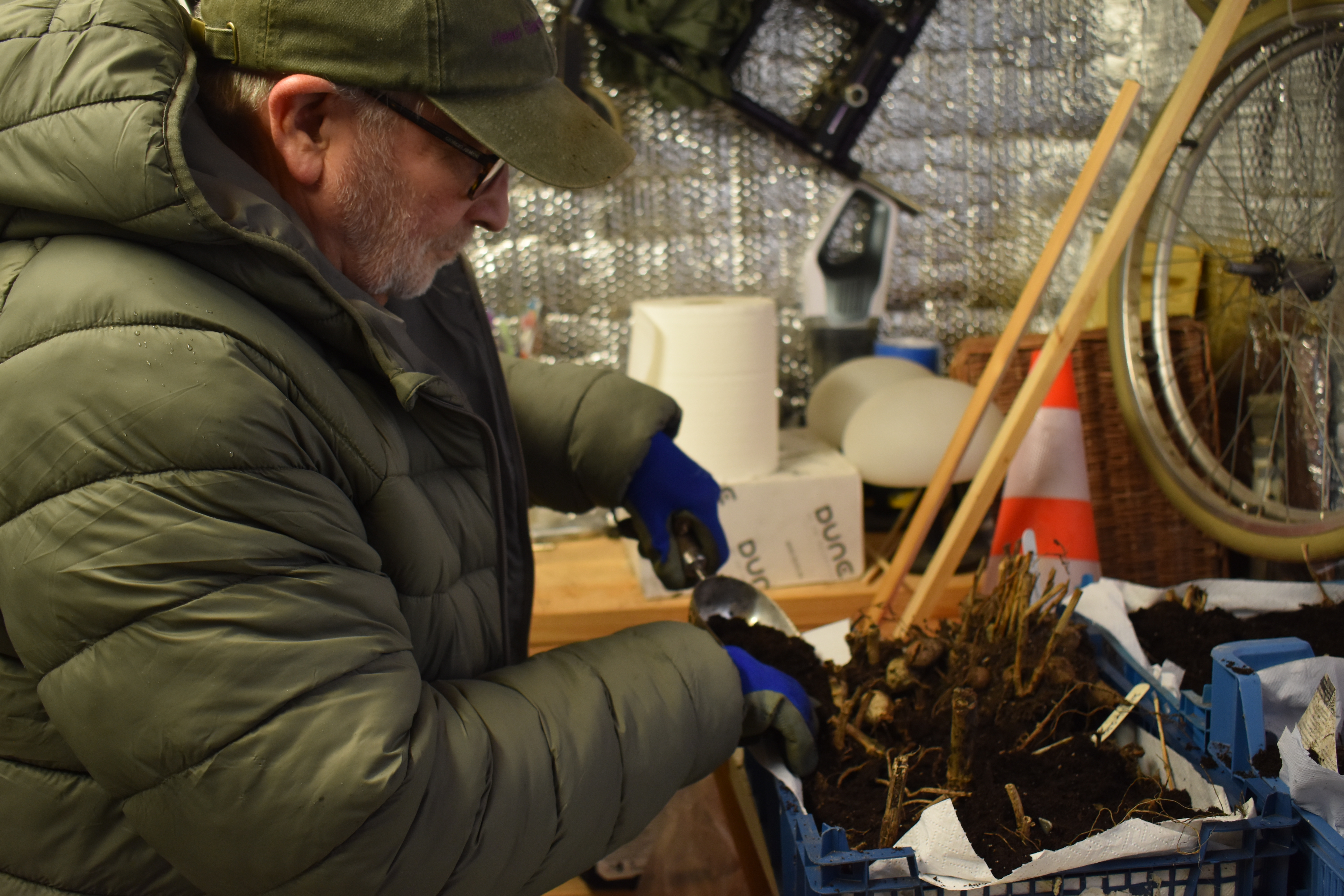 Cleaning up our dahlia tubers. Dahlia tubers ready to shoot.