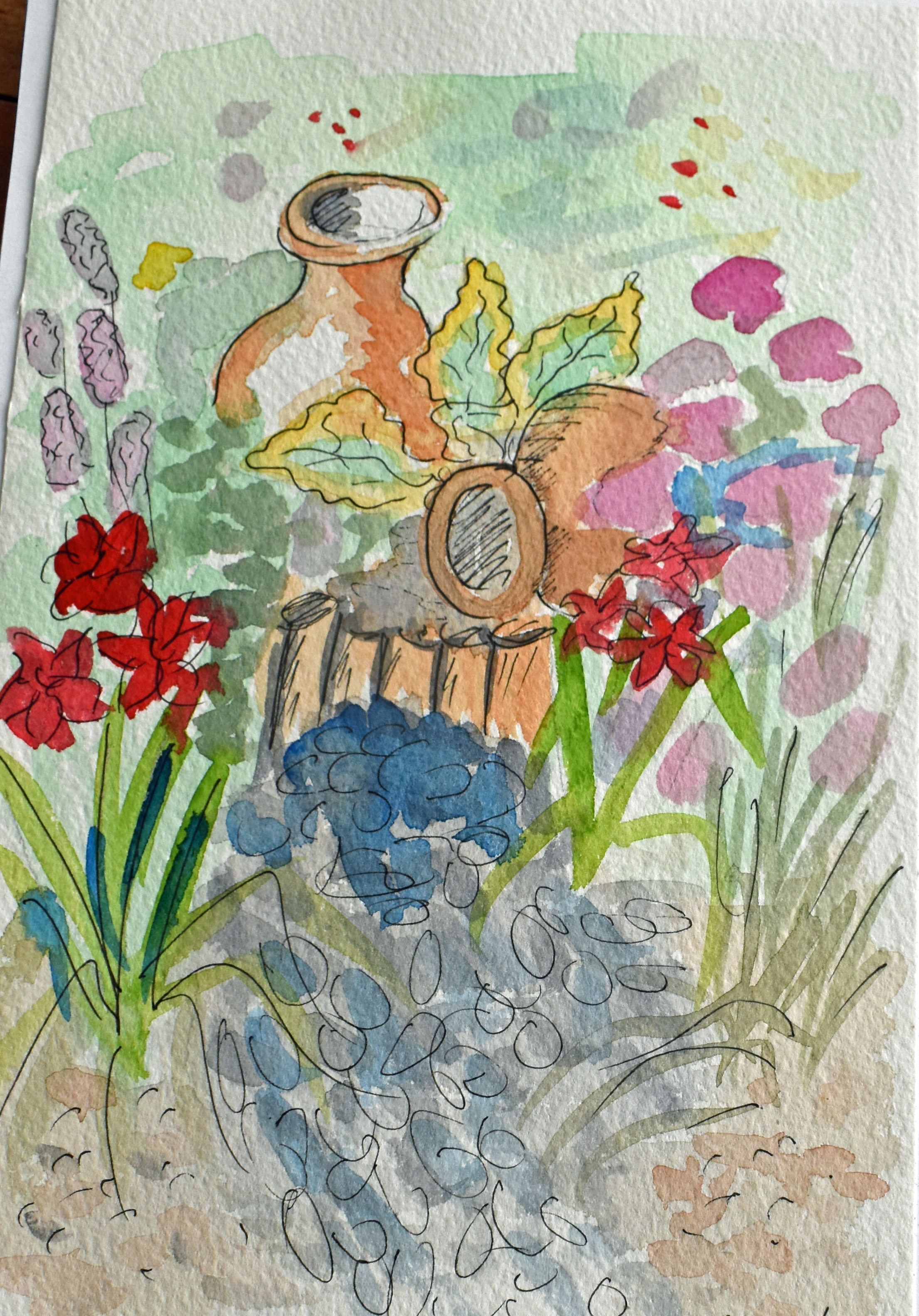 “While sorting out some papers we came across one of my watercolor sketches of the garden , painted in 1997.”