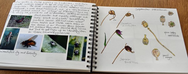 On the first page I wrote,“February’s flowering plant of the month, Iris reticulata.” at the page top above a photograph of Iris reticulata ‘Cantab’ and two of my watercolour sketches of the same iris plus one called ‘George. I used Japanese brush pens.