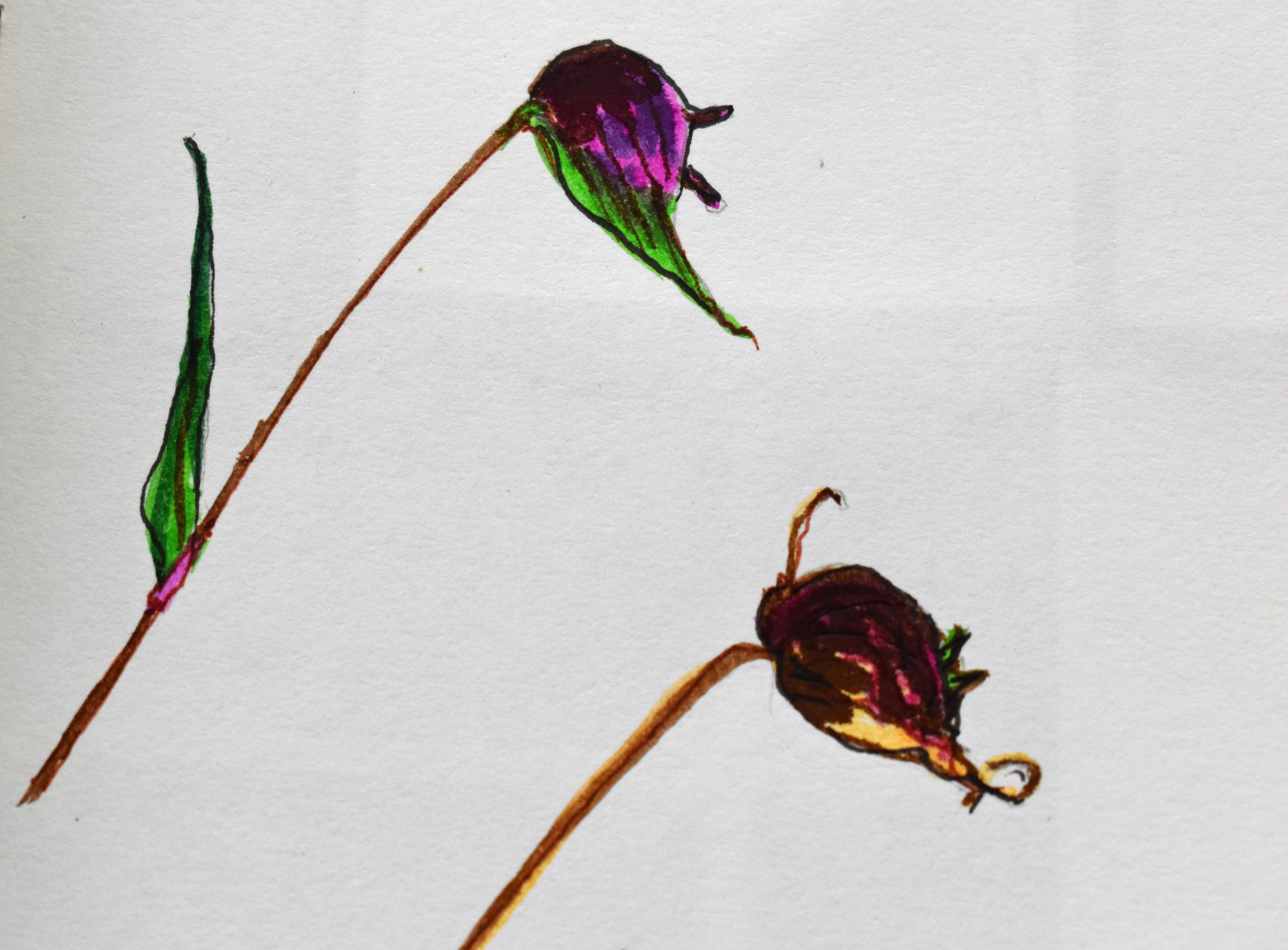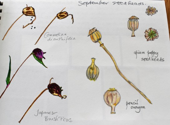 More sketches created using Japanese brush pens appear on the next page where I selected a few branches of some of my favourite Salix shrubs, willows, Salix daphnoides, Salix gracilistyla ‘Mount Aso’ and Salix gracilistyla ‘Melanostachys’. We love these for their unusually coloured catkins.
