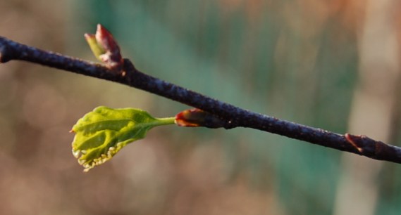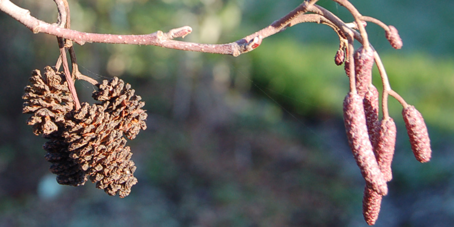 We took a leisurely walk around the “Interest Trail” which took us through or close to most of the community gardens – the orchards, wildlife borders, seasonal gardens and meadows. Near the car park the first green bursts of new life have appeared, the leaves and catkins forming on the birches. The young catkins stand bolt upright at this stage but will soften in colour and structure when they dangle down in the spring.