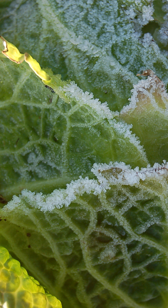 The strongly veined wrinkled leaves of the Savoy Cabbages withstand the cold wrapped into tight balls.