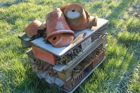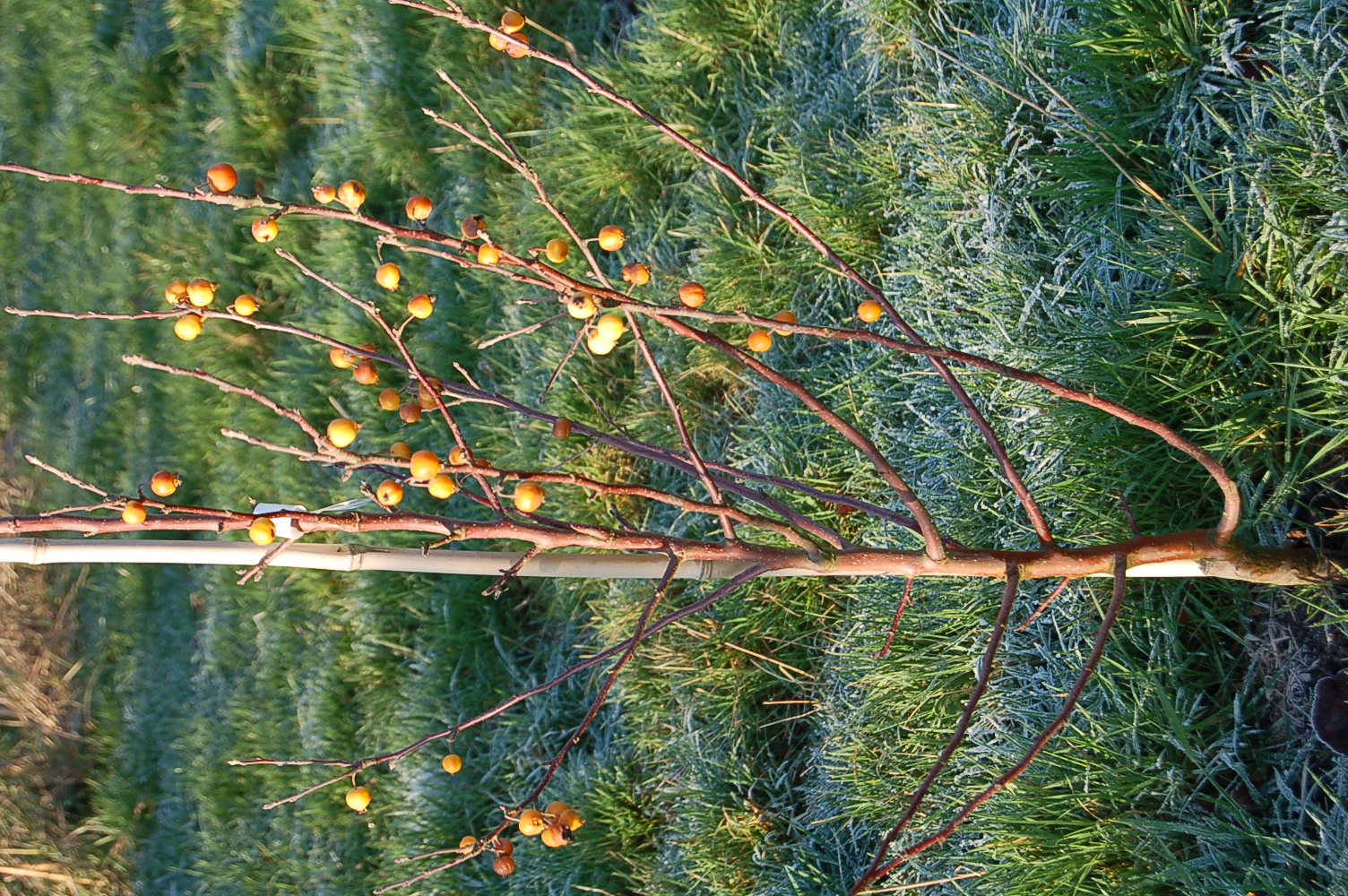 Our Winter Garden has so much of interest that I shall publish a blog just featuring it within the next few days, so for now we shall move on to the second orchard where the golden fruits of Malus “Evereste” have escaped the attentions of the winter visiting thrushes but I suspect they will soon be discovered and devoured. The insect stack in the orchard is there to attract beneficial insects who provide our very wildlife-friendly pesticide. The stack should give them some shelter to help them survive the winter cold and wet.