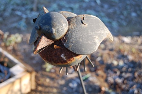 Plastic bottles on canes support last year’s netting and still protect any overwintering crops from hungry Wood Pigeons.