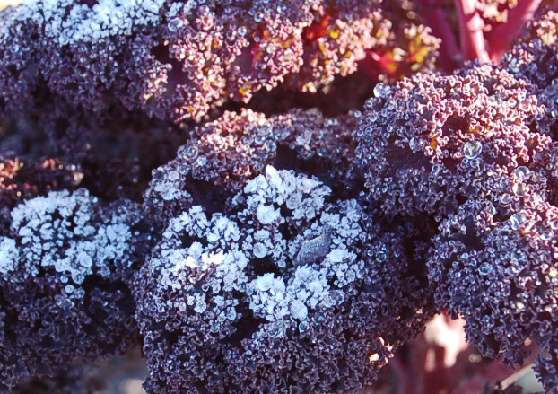 Kale defies the cold and stands upright and proud even with ice droplets and frost splattered on their tightly curled leaves.