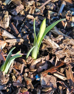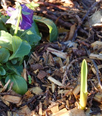 As we wandered back towards the car park we passed through the wildflowers meadows long since cut to the ground, but showing promise for next summer in its tiny seedlings. One lone flower braved the cold – a pale blue cornflower. Leaving the lotties we noticed promises of flowers from the bulbs in the car park border and in the half-barrels in the gateway.
