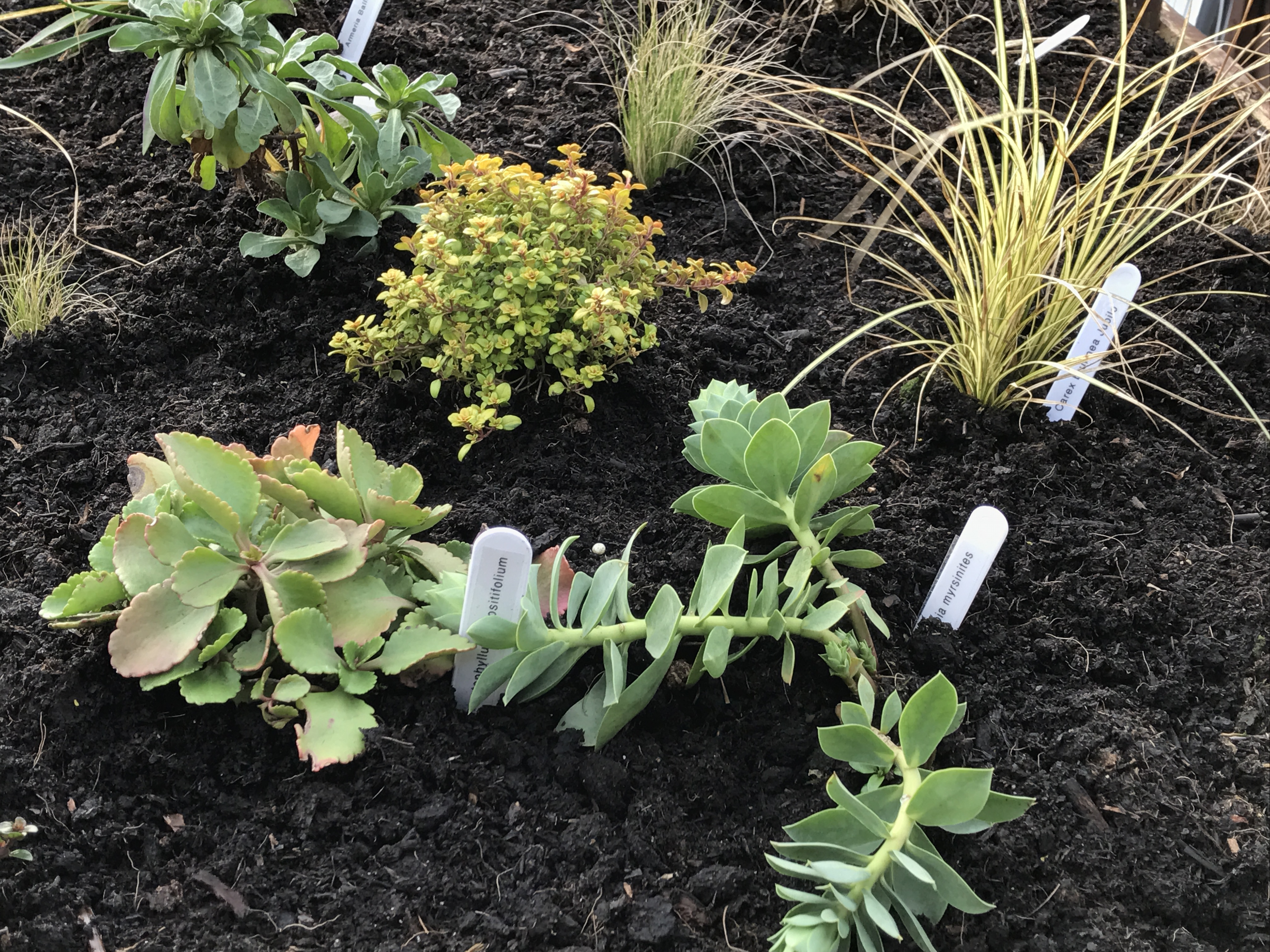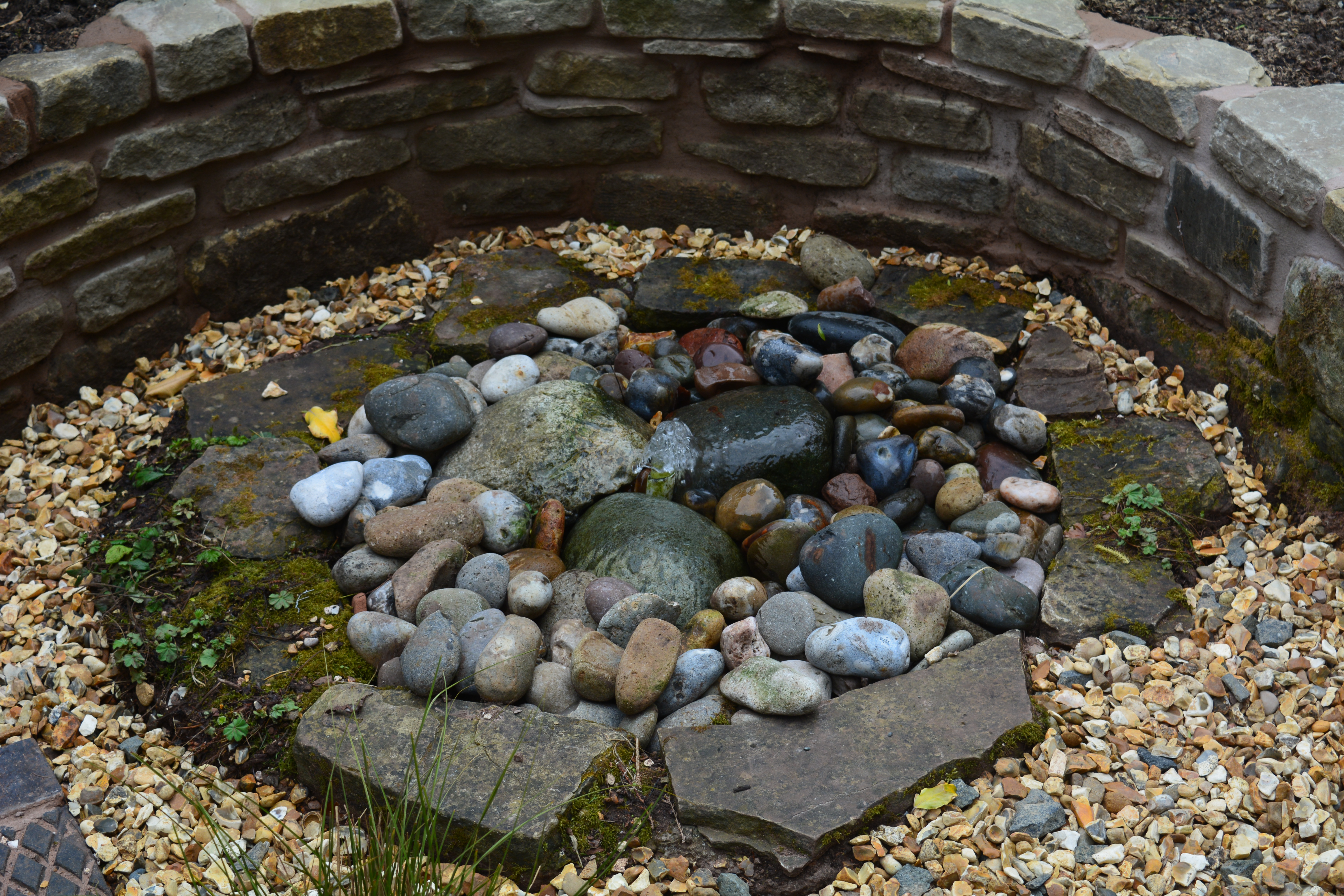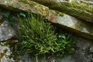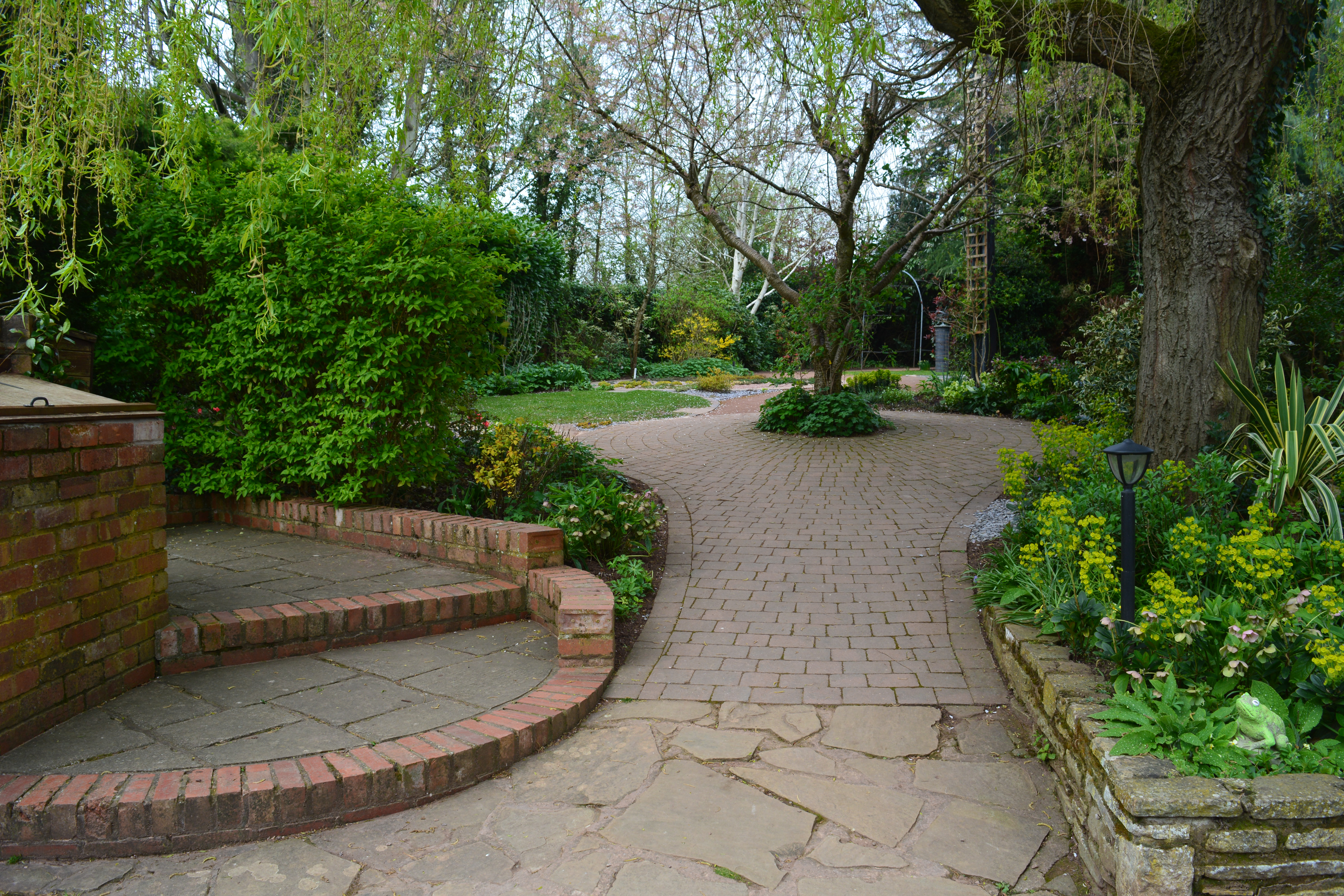The autumn light emphasised the texture on this bronze sculpture and on the much newer tunnel archway which marks the way into the display gardens. It gave an all new look to the low slate walls around one of these gardens too. It again emphasised the texture but brought out extra colours too. The light similarly added colour to the plants and to the glass panels featured in another of the display gardens.