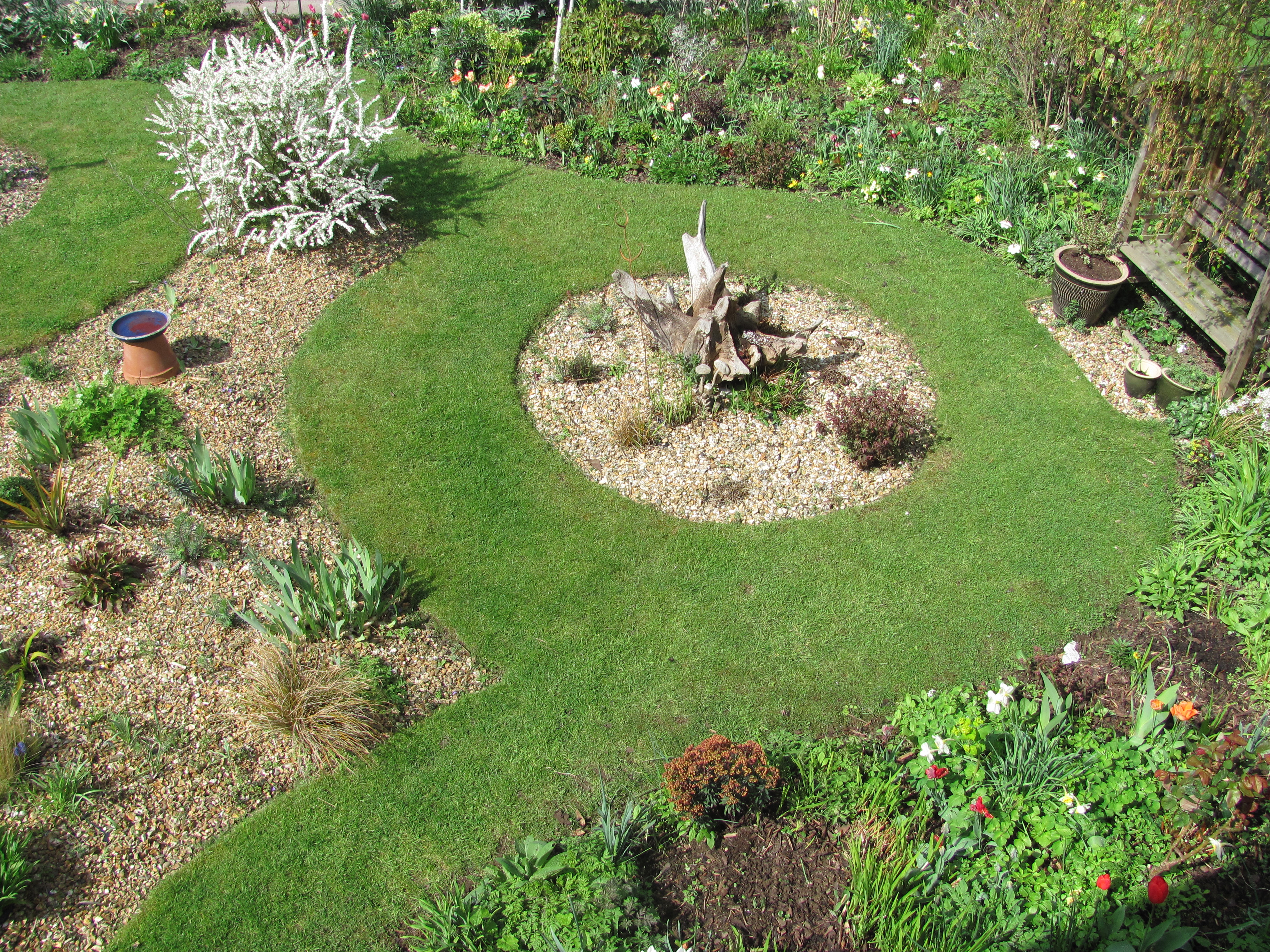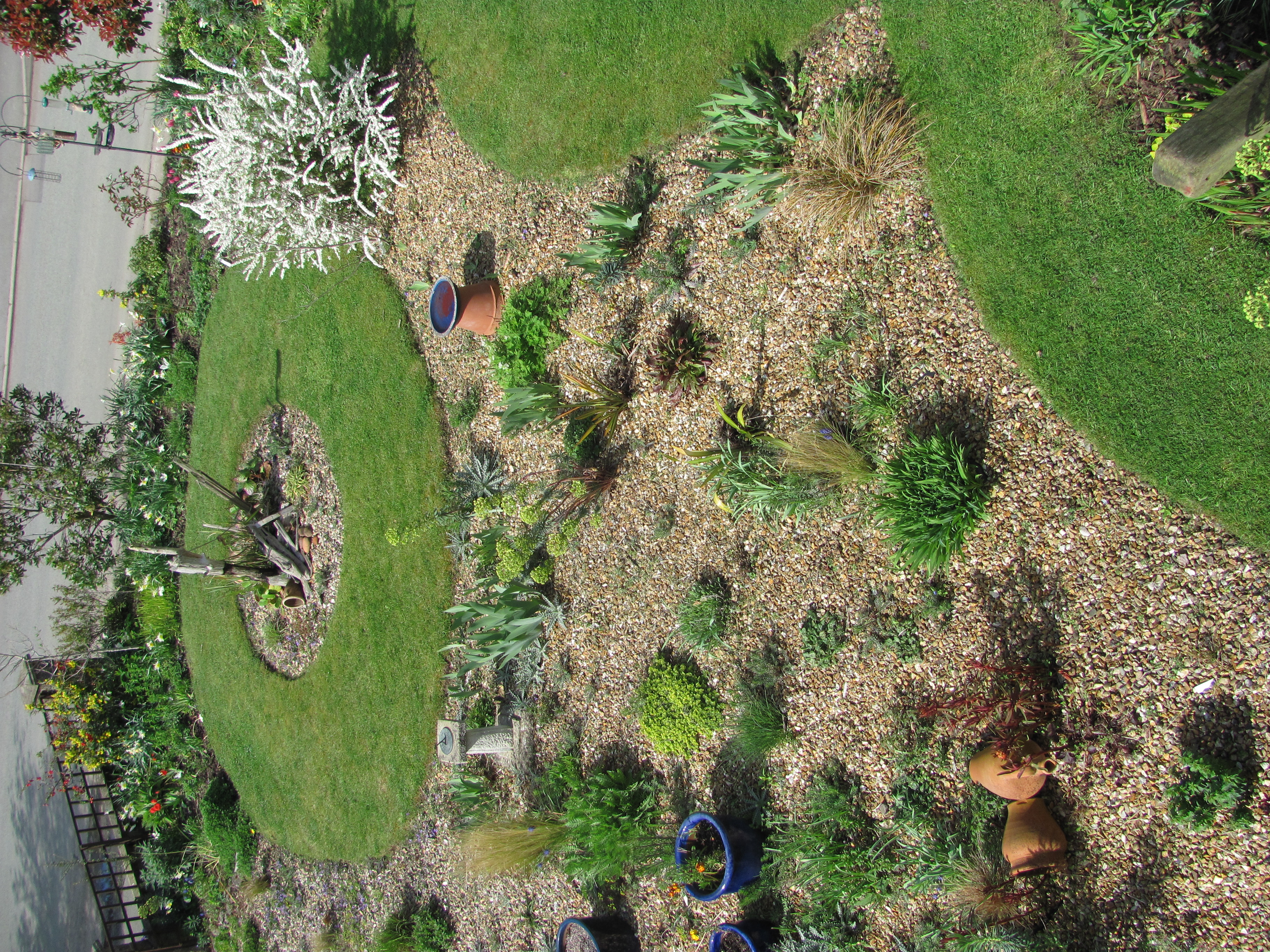 Looking down on your garden gives you a chance to study the design and exposes any re-shaping of beds that is required. So we occasionally take photos from our upstairs windows. The photos of parts of our front garden in early spring show the design based on circles and flowing lines with grass reduced to a minimum to give a route which is soft underfoot.