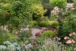 As we reach the half way point in the year the garden really comes to life with bright green fresh growth and so much colour from flowers, herbaceous perennials, shrubs and climbers especially roses and clematis. I began by writing, “At the beginning of June we were still worried about how dry the garden still was and longed for some rain. Luckily a few days into June and this is exactly what happened. And luckier still was that the planned group visits to our garden at that time were not interrupted by wet weather. After rain, until the droplets on their flowers and buds dry off, make roses look sad and dejected.”
