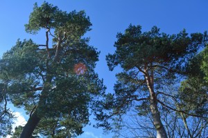 We followed a gravel pathway alongside a border full of evergreen shrubs and trees, both conifers and broadleaved. The two below looked so different under the dull sky, one a gentle pale green and gold the other a silver grey, its needles being more spaced out along each stem. Its next door neighbour is a much denser bush.