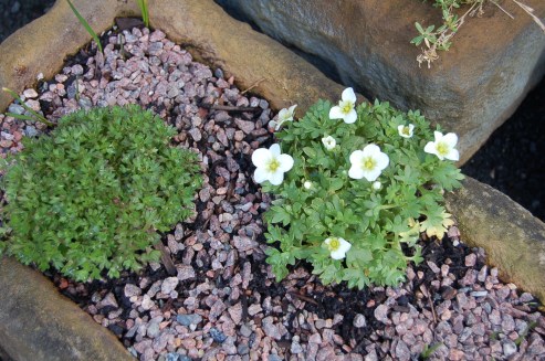 “We planted up our water garden in a bowl, which Ian our helper, prepared back in February. We had to get it level first though – quite a challenge! We planted it up with 5 plants – Iris ‘Black Gamecock’, Isolepsis cernua, Nymphaea ‘Snow Princess’, the oxygenator Ceratophyllum demersum and a tiny bullrush Typha minima.”