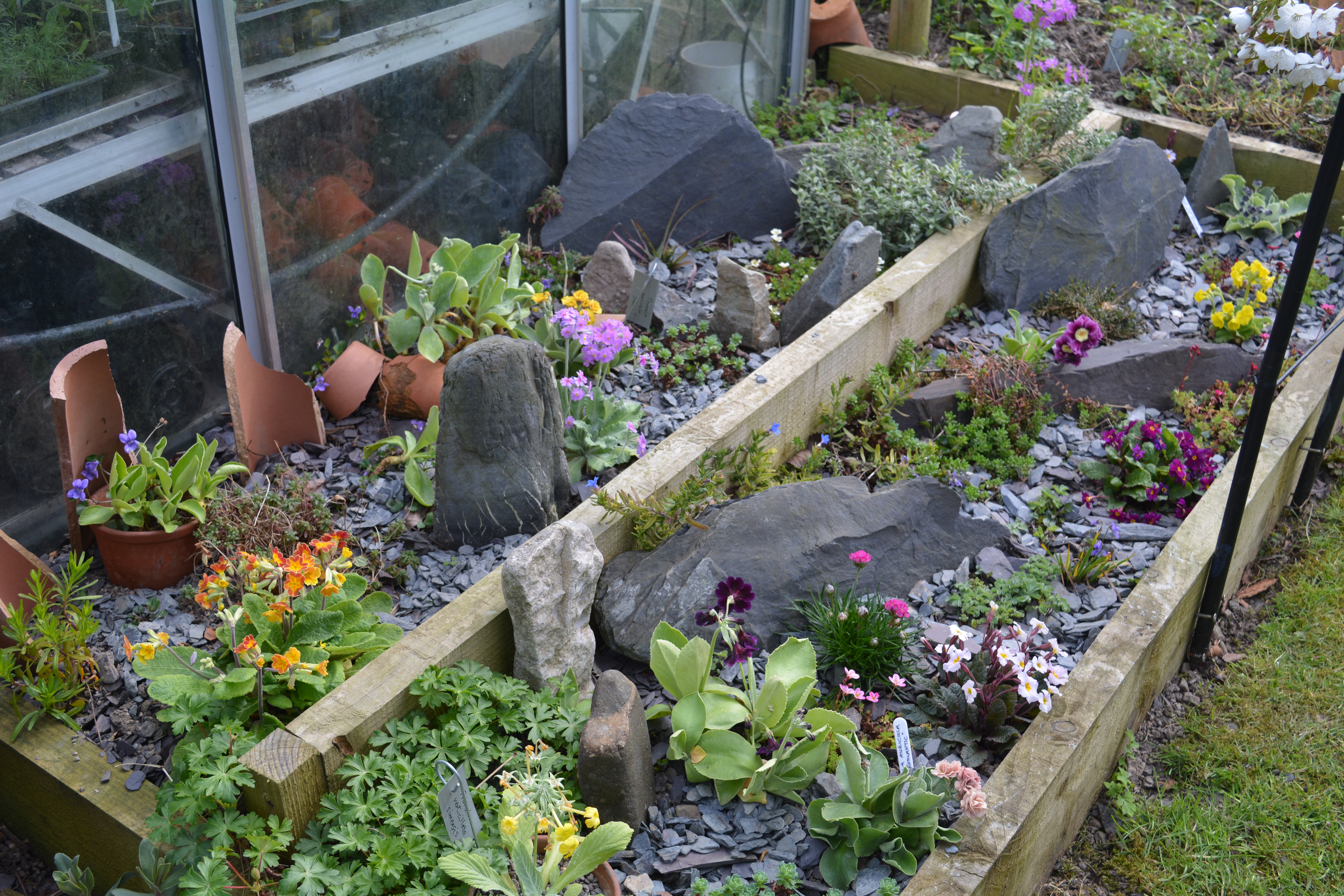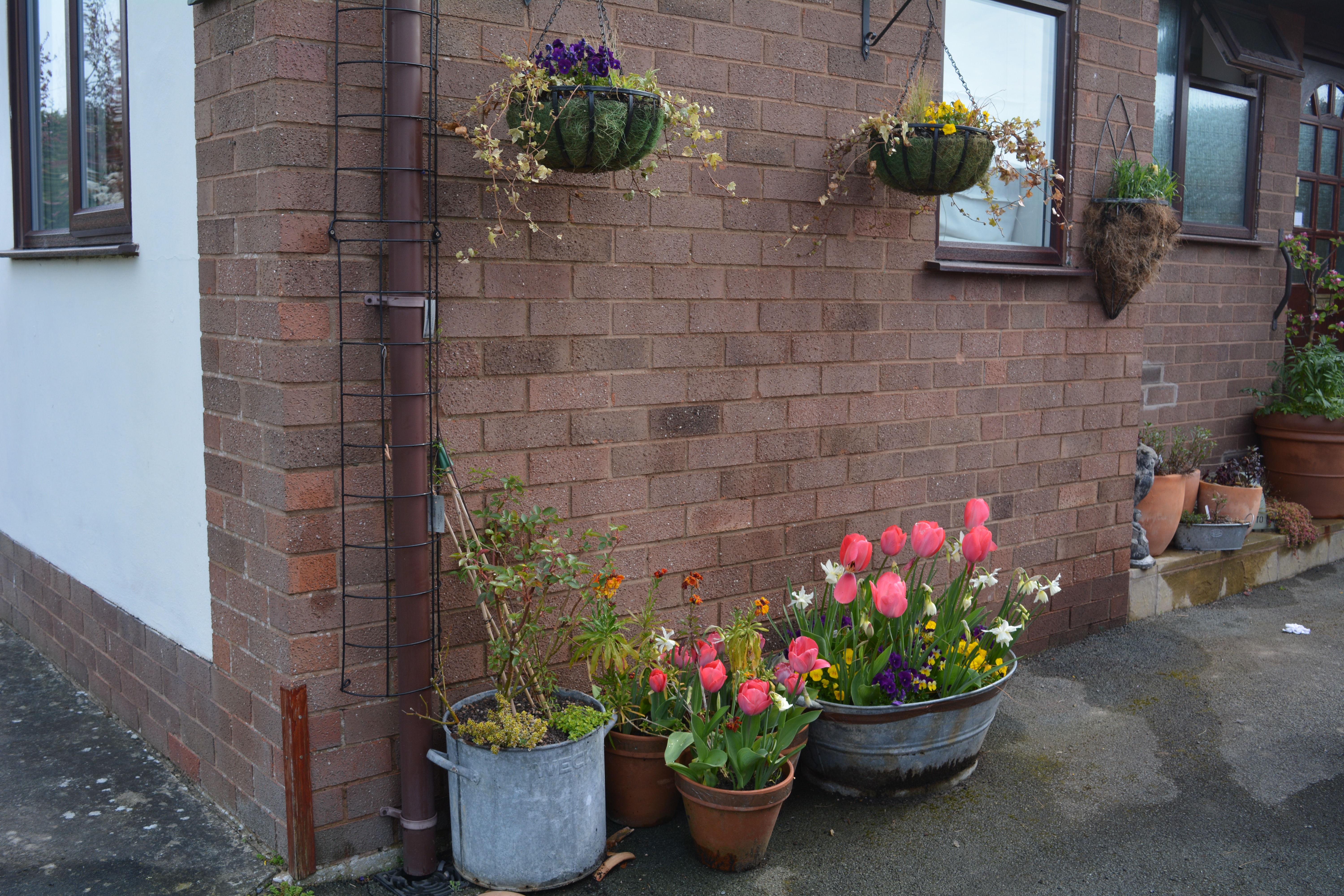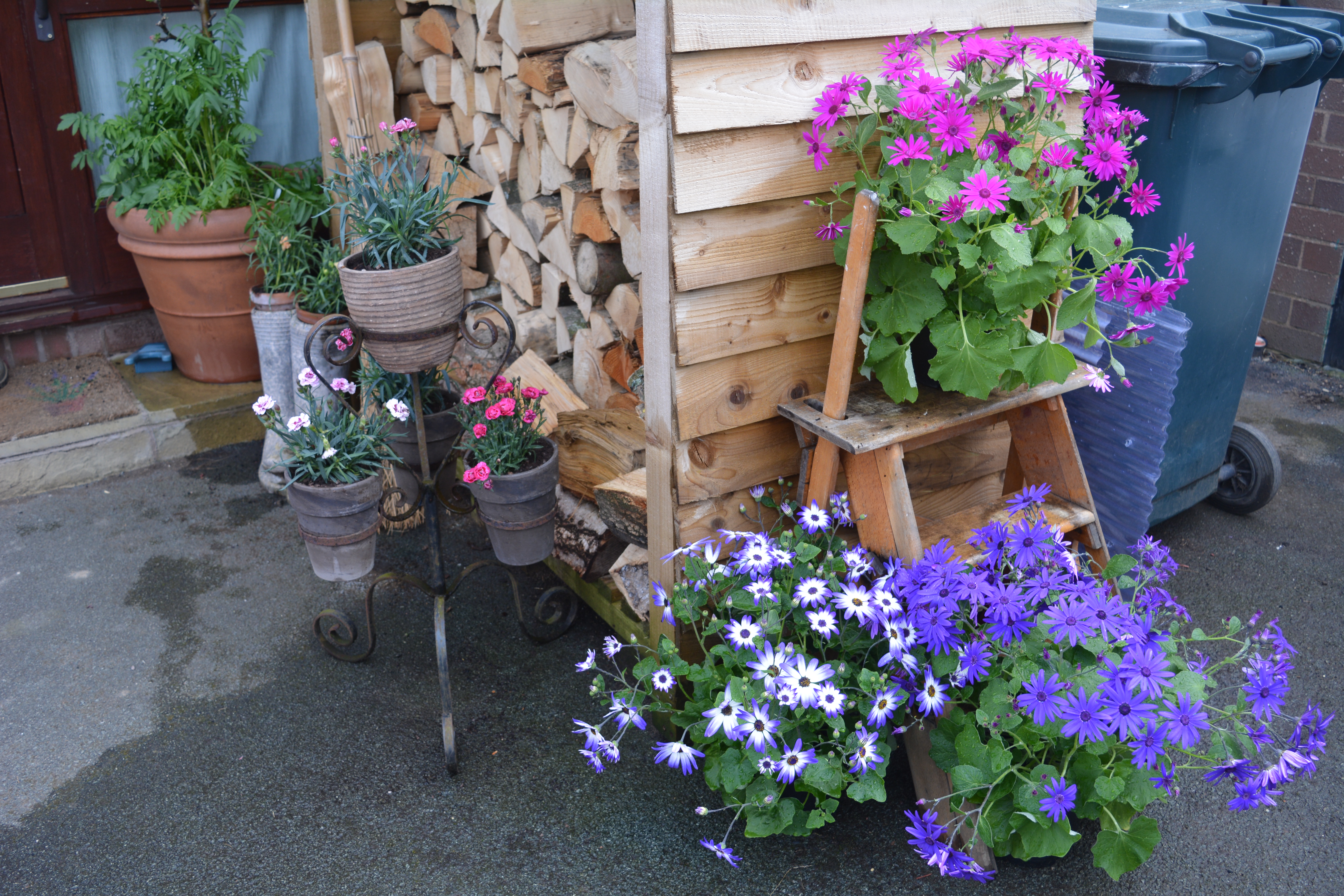 As we followed the narrow path towards the back of the cottage the gardens came into view and we knew we were in for a colourful wander. The terrace of stone slabs overlooked the garden and sitting here enjoying a refreshing tea and tasty cake we could get views over most of the garden. Brightly coloured annuals and tender perennials grew vigorously in pots.