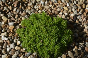 We followed a gravel pathway alongside a border full of evergreen shrubs and trees, both conifers and broadleaved. The two below looked so different under the dull sky, one a gentle pale green and gold the other a silver grey, its needles being more spaced out along each stem. Its next door neighbour is a much denser bush.