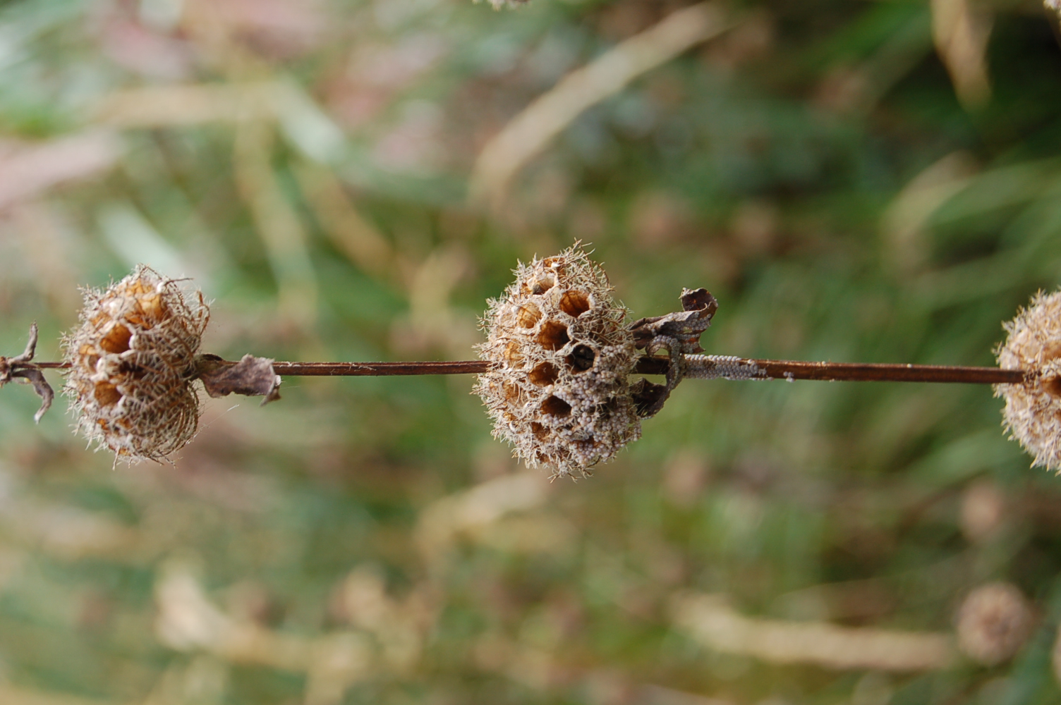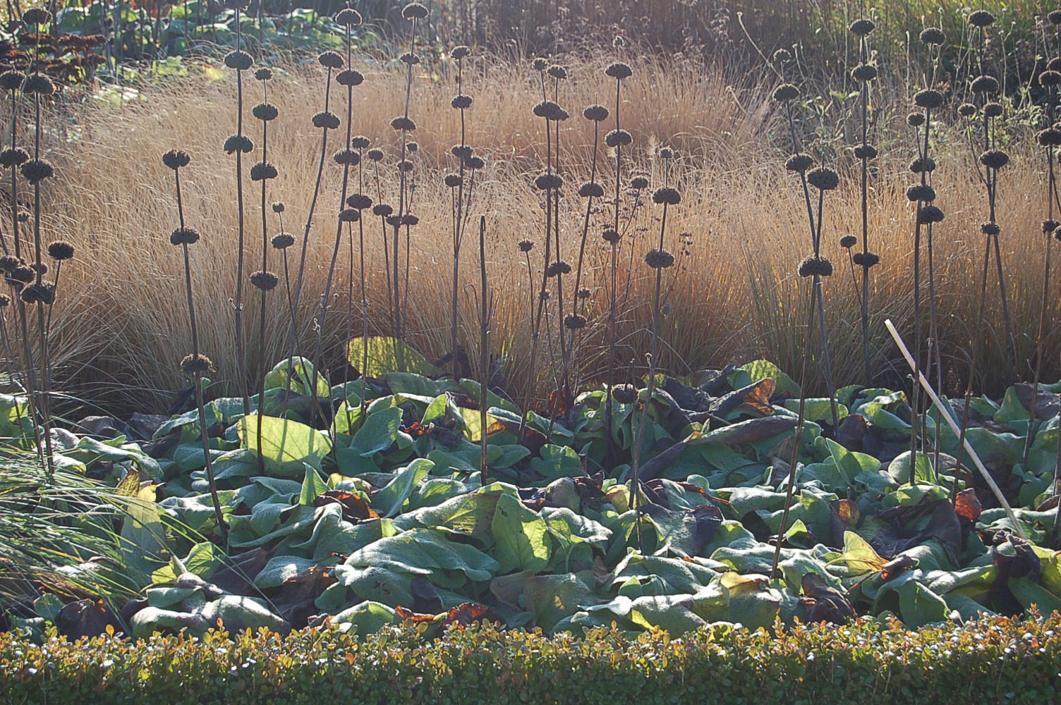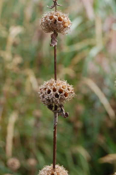 Phlomis, having given bright sunshine coloured flowers in summer, were now starring again with their dark brown almost black spheres of seed heads spaced up the length of their straight stems.