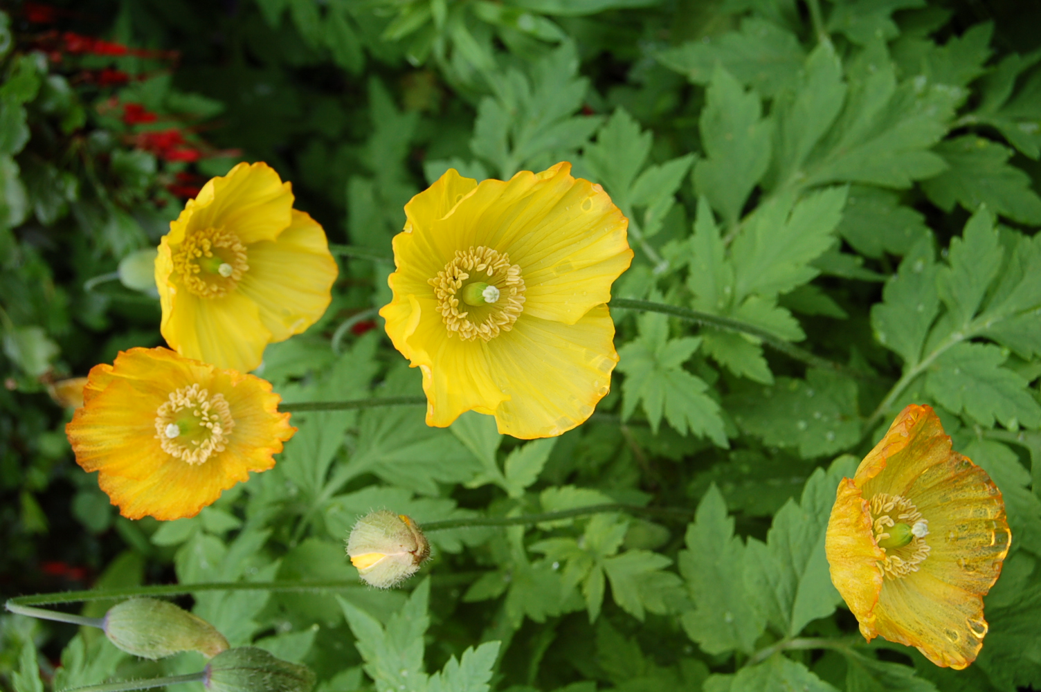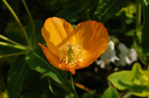 Where the blue poppy enjoys shade, its yellow Welsh relative opens out its flowers spreading the petals wide when the sun comes out but as evening falls they close back up to hide from the darkness. These delicately petalled poppies come in all shades of yellow from the palest lemon to almost orange, with one of the prettiest being the yellow with a slim fringe of orange.