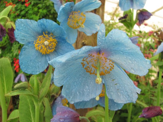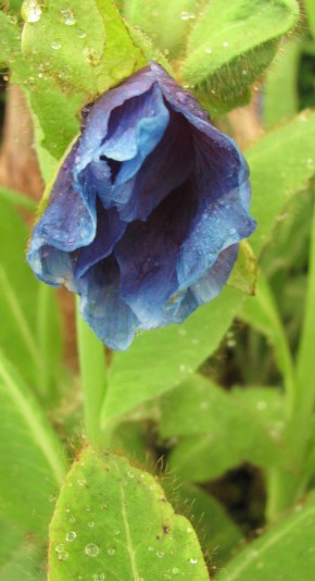 Blue meconopsis (Meconopsis grandis) are a challenge to grow and many gardeners are tempted to give it a go once they have seen them growing healthily. Their delicate almost see-through petals look too thin to survive the slightest whiff of wind or a drop of rain landing on them. Within their blue purity are slight hints and veins of red seen only when the light from the sun falls on them. In contrast to their blue petals golden centres and stigma grace the centre of each bloom.