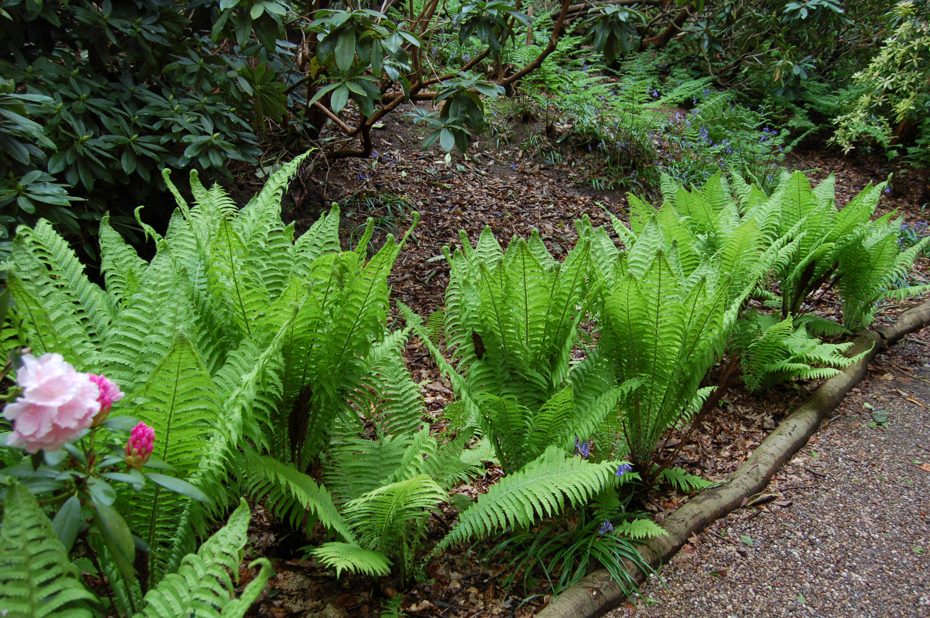 Ferns are an exciting element in the woodland or shade garden in May as fresh fronds unfurl and open to reveal strongly textured and patterned foliage.