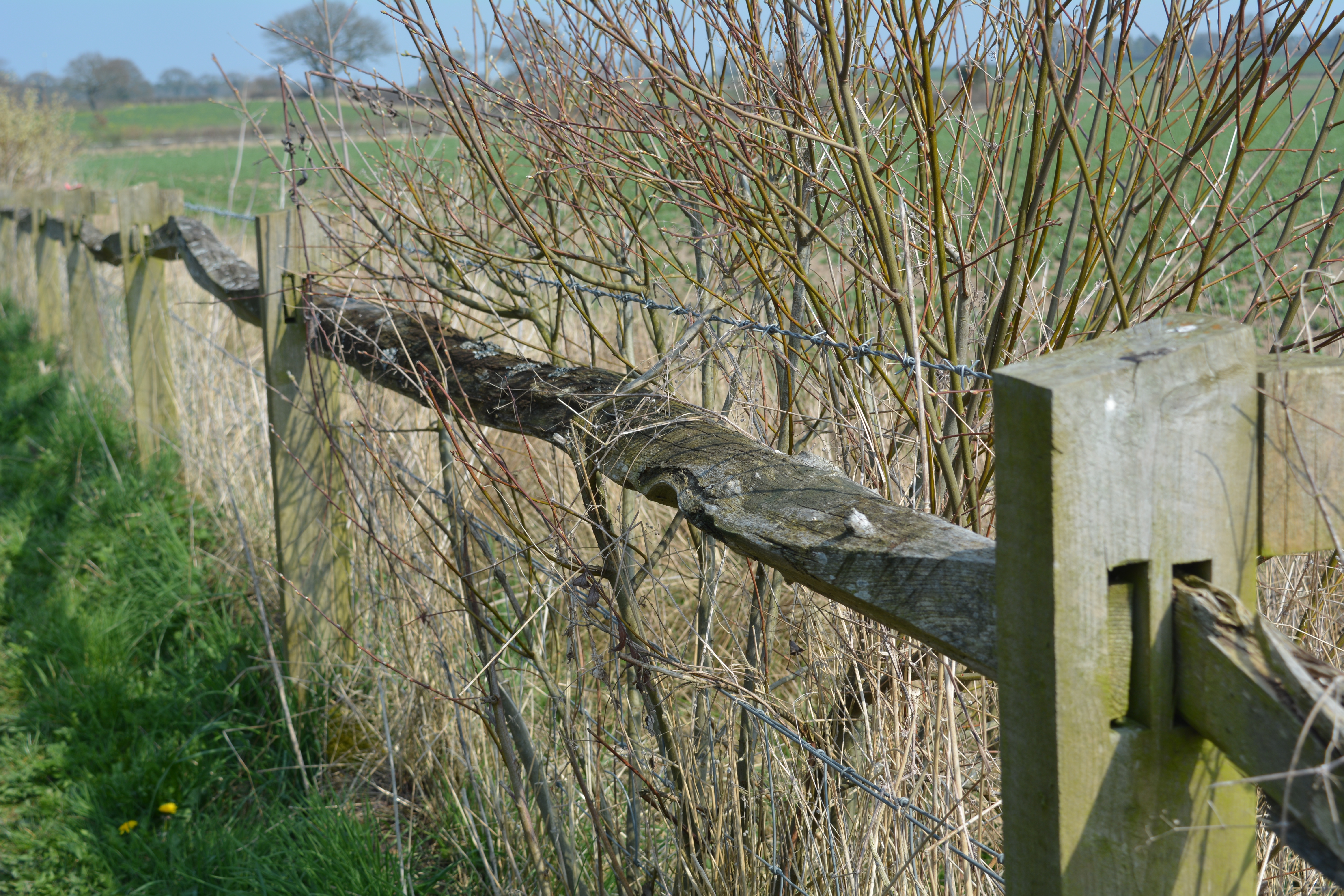 We began our walk back around the battlefield site following a narrow gravel path between a tall hedge and an old chestnut fence. In a field showing signs of ancient ridge and furrows agriculture we spotted a drainage pond rich in vegetation and a old fallen tree with the most amazingly shaped trunk and branches.