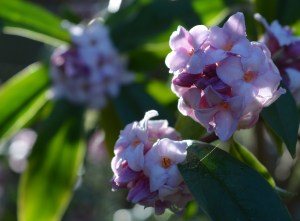 We have always admired the way John displays his hellebores as cut flowers by using just the flower heads floating in shallow bowls of water. We have followed his example at home for several years now. It is such a simple but clever idea, and a great way to finish reporting on our February visit to John’s Garden.