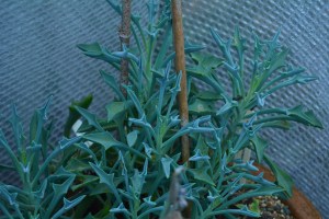 I then went onwards with my camera into the greenhouse which is not yet heated at all, so we are simply keeping things ticking over. Soon we will put heat on and the heated propagating bench in readiness for the exciting task of seed sowing. I wrote, “The greenhouse is a busy place in the winter full to overflowing with over-wintering sensitive plants, autumn seedlings ticking over and cuttingstaken late in the year.”