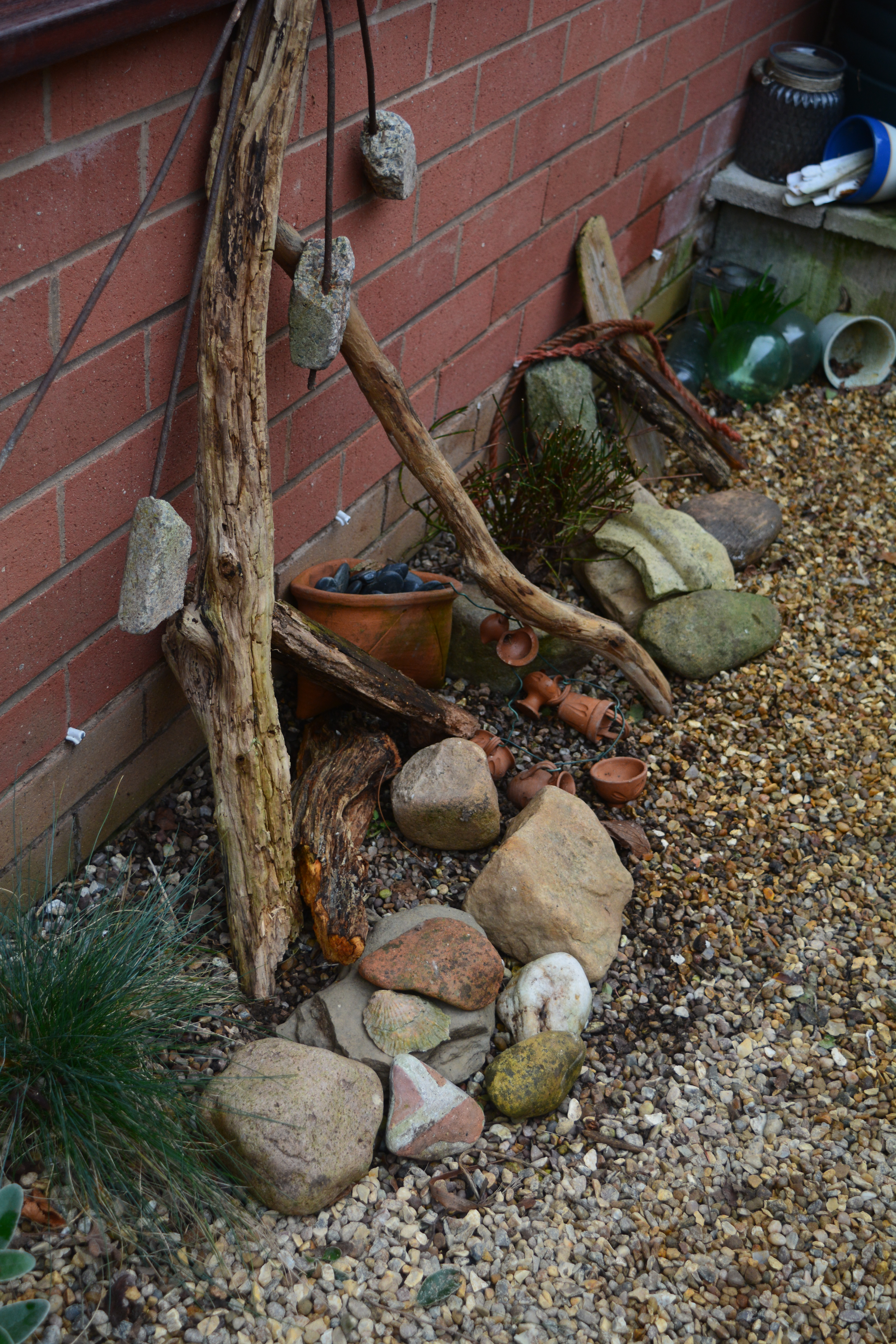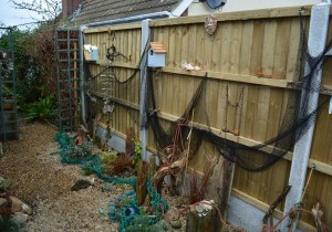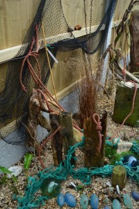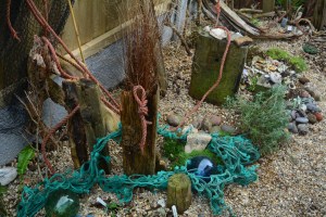 I wrote, “We had great fun rebuilding the Seaside Garden despite cold temperatures made more severe by the icy cold winds. So, wrapped up well against this typical January weather we put up old fishing nets from Scotland, sea-washed driftwood from Devon and Anglesey plus shells and pebbles.”