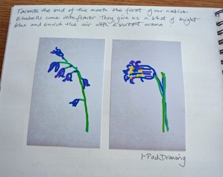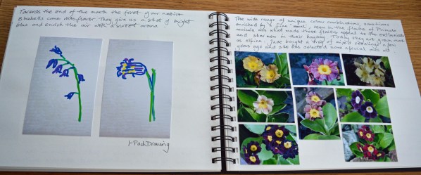 So once again turning the page the next double page spread features bluebells and Primula auriculas. I wrote of bluebells, “Towards the end of the month the first of our native Bluebells come into flower. They give us a shot of bright blue and enrich the air with their sweet aroma.”