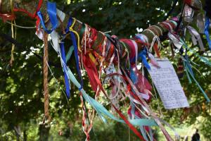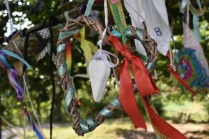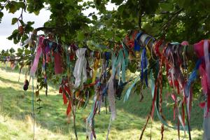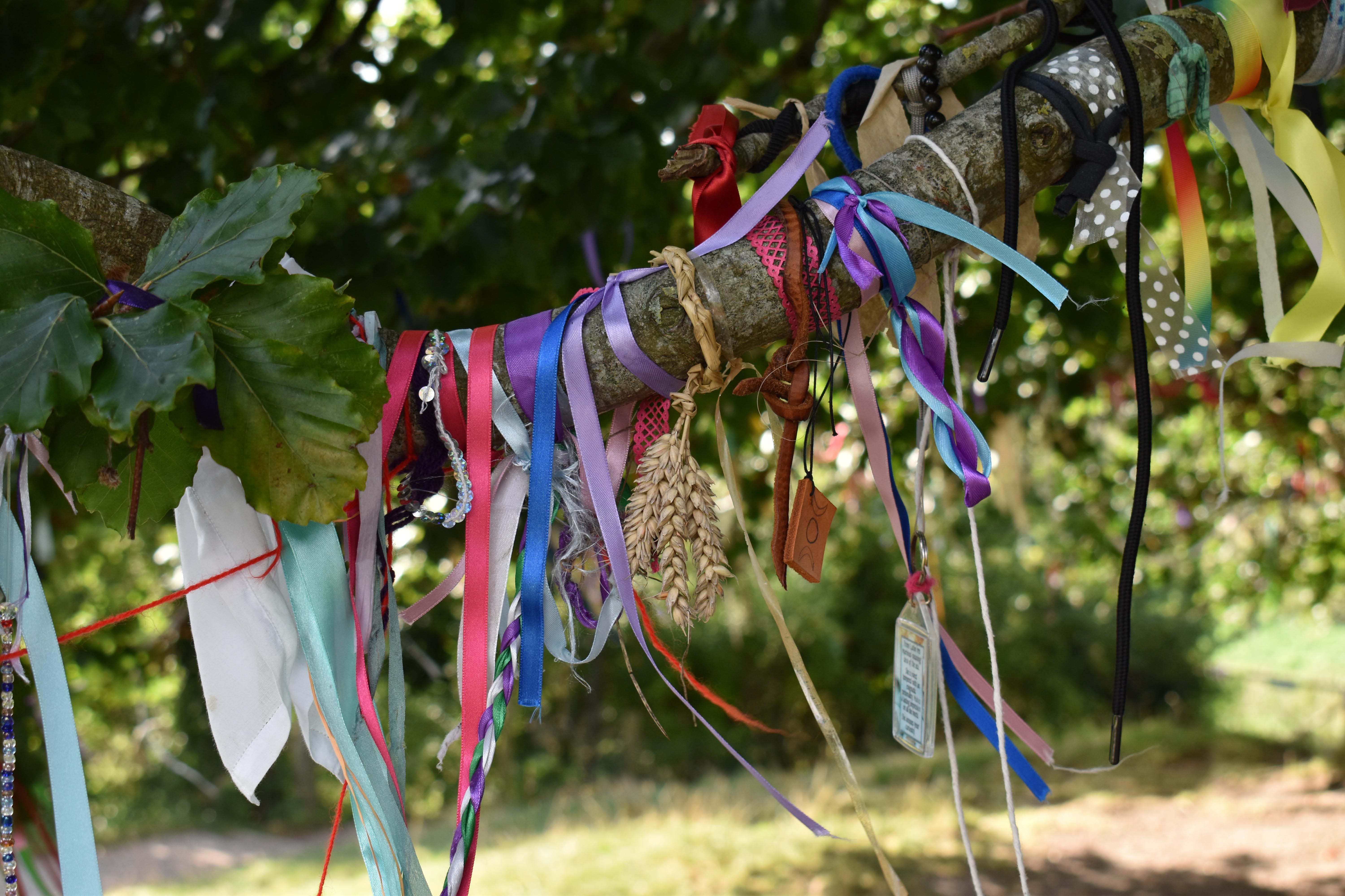 Partway way around our circular walk around the stones we came upon a magical tree with obvious special meaning to some. The tree was decorated with ribbons, written thoughts and natural objects in memory of a lost friend. It felt a special place as we stood beneath its boughs.