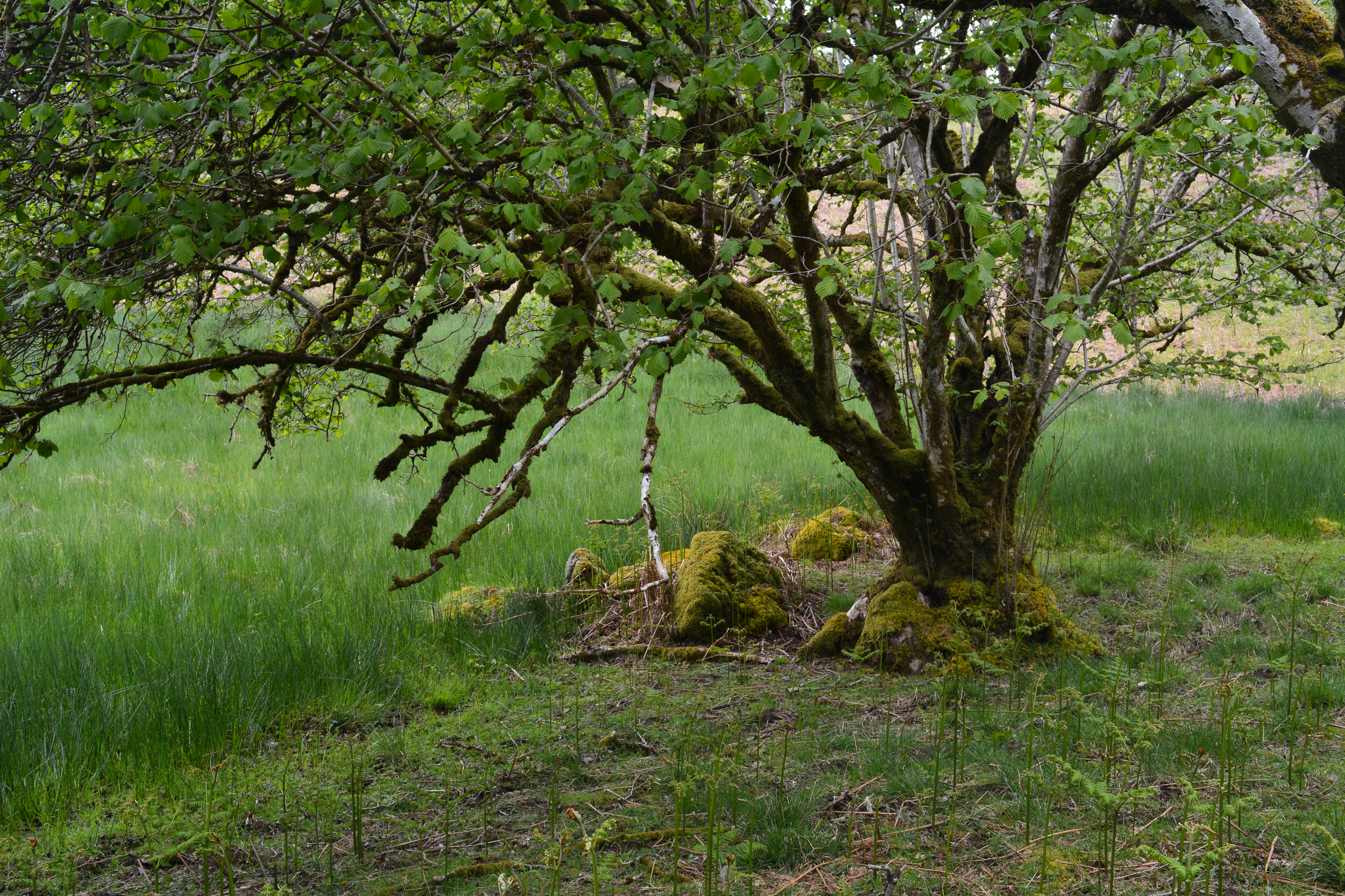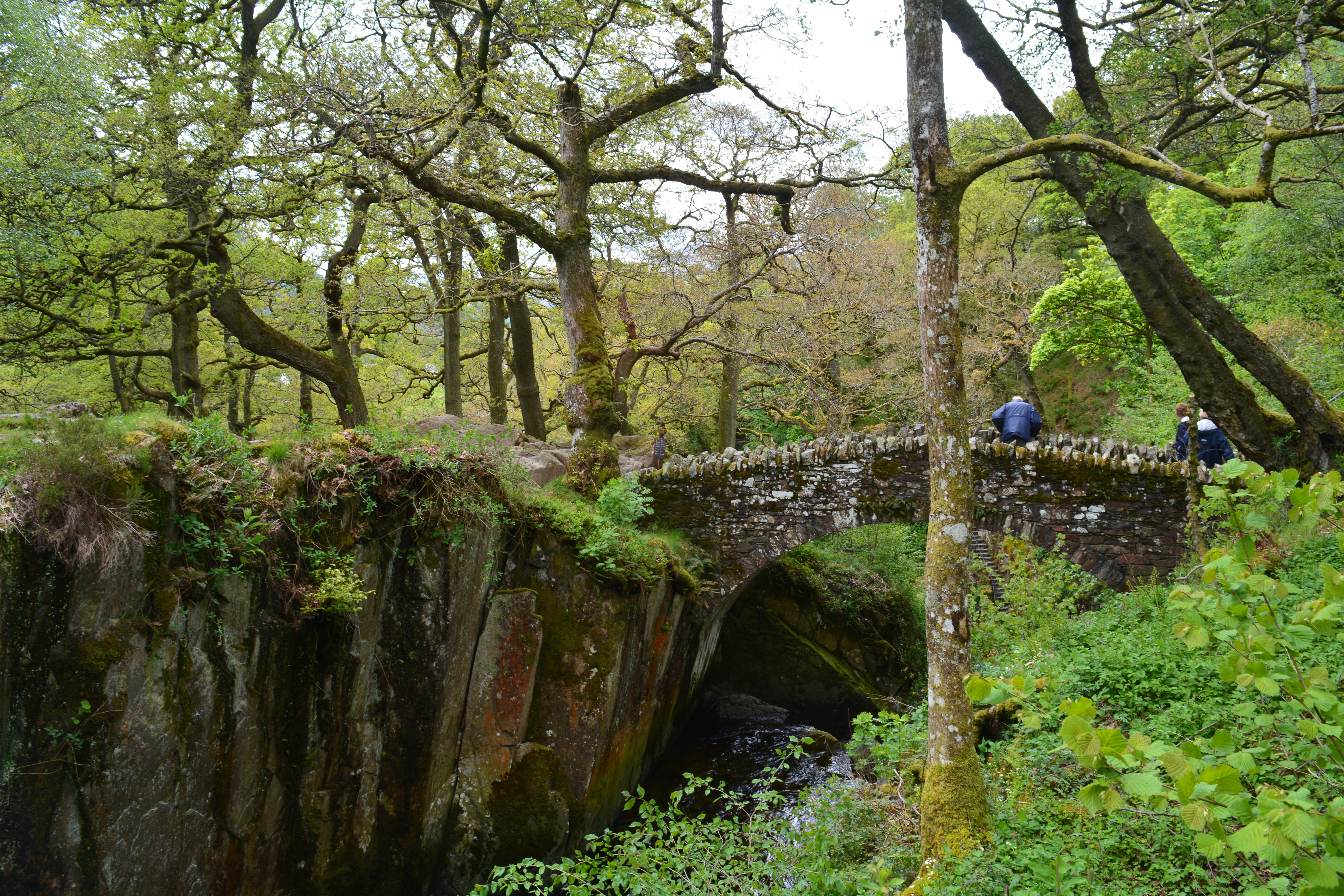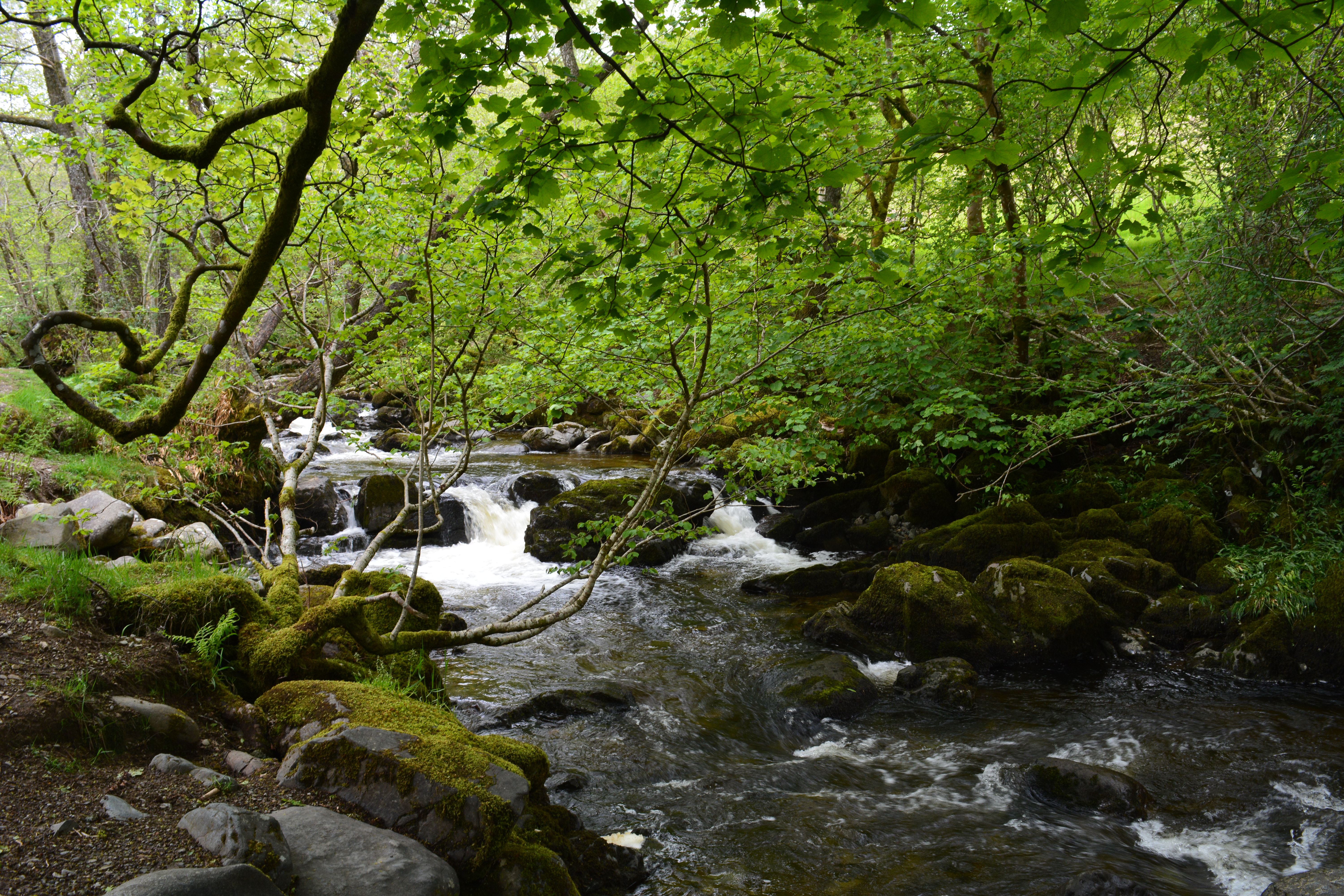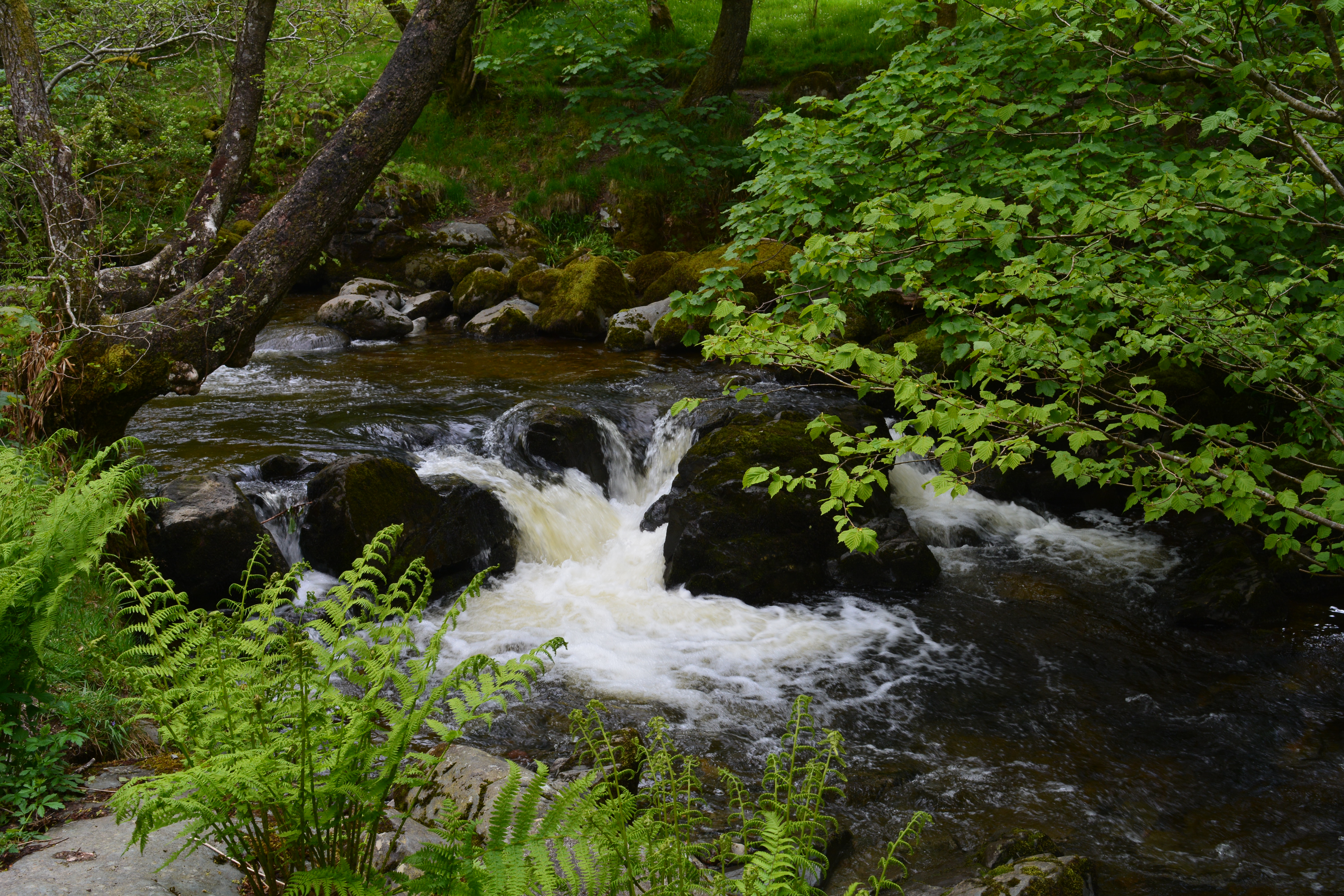An area of Bodnant gardens we have rarely reached over the years because of my mobility problems is the deep steep-sided valley with tall trees towering over a beautiful sparkling stream which meanders along its length. After recent surgery I can now manage to get down to this magical dingle. The magical atmosphere is created by the huge trees that tower above visitors who wander the gravel paths along the valley running close to a clear mountain stream, and on the banks beautiful bog and water loving plants grow happily. Primulas, hostas, ferns and Skunk Cabbage add colour and texture to the scene.