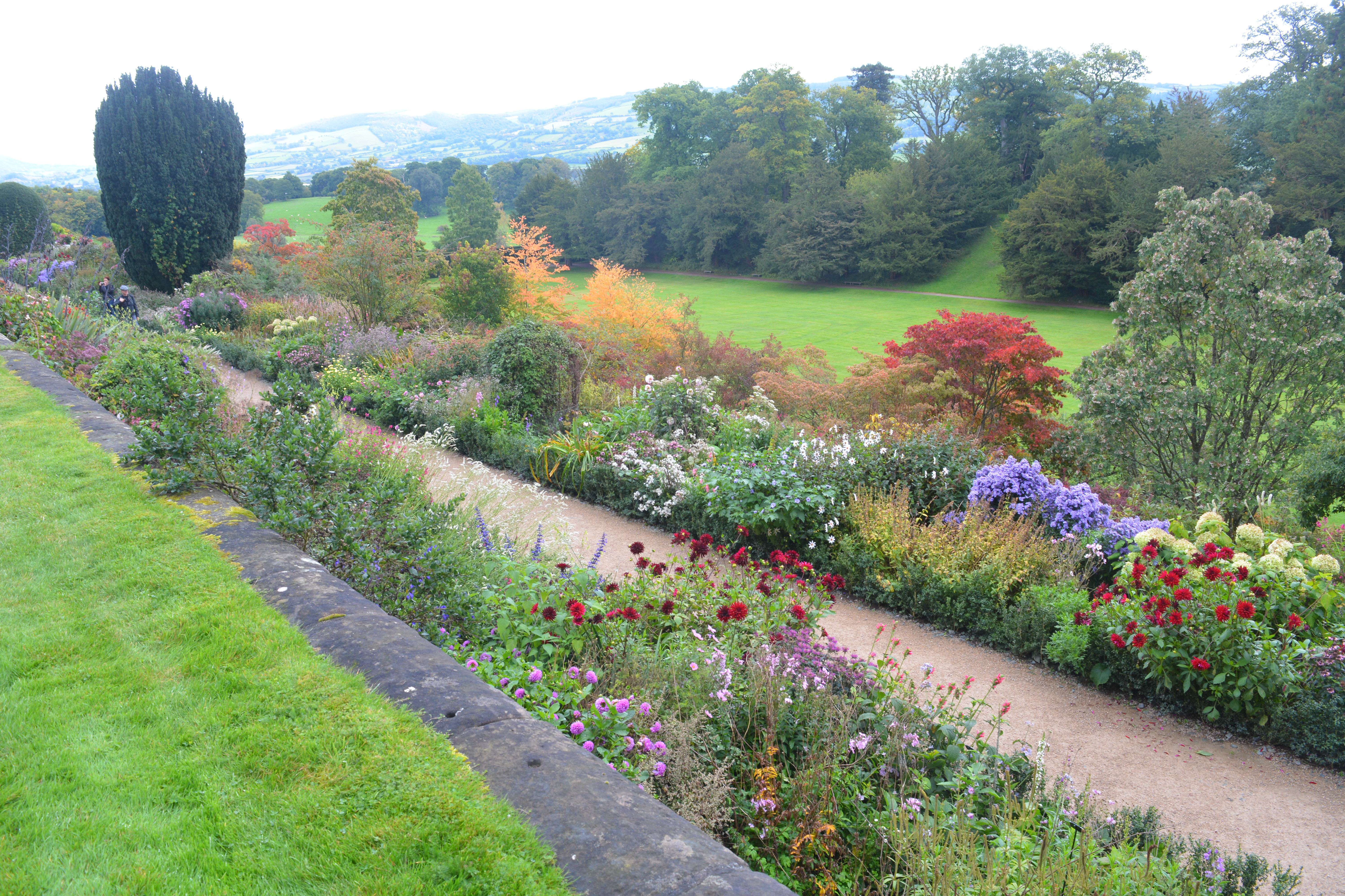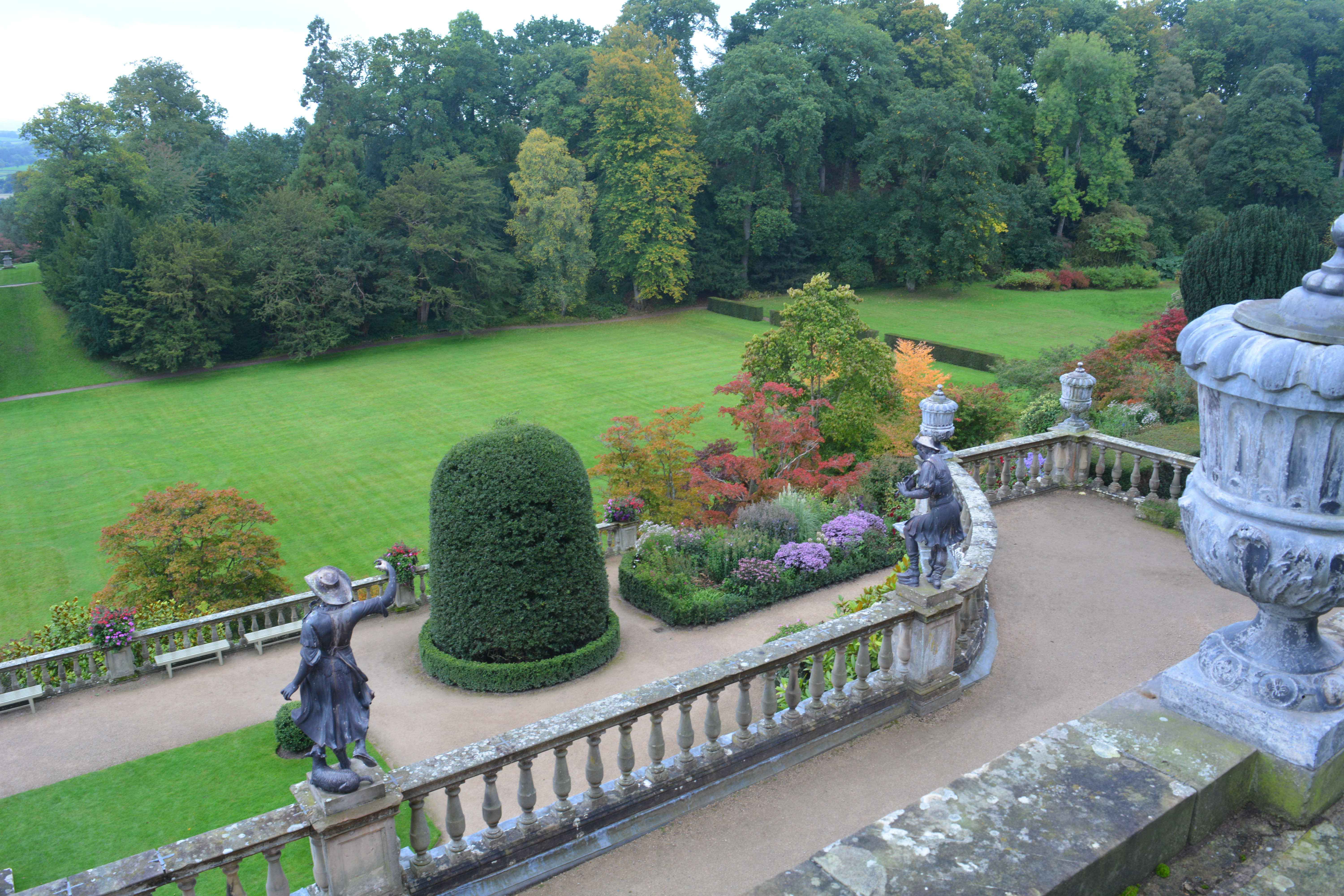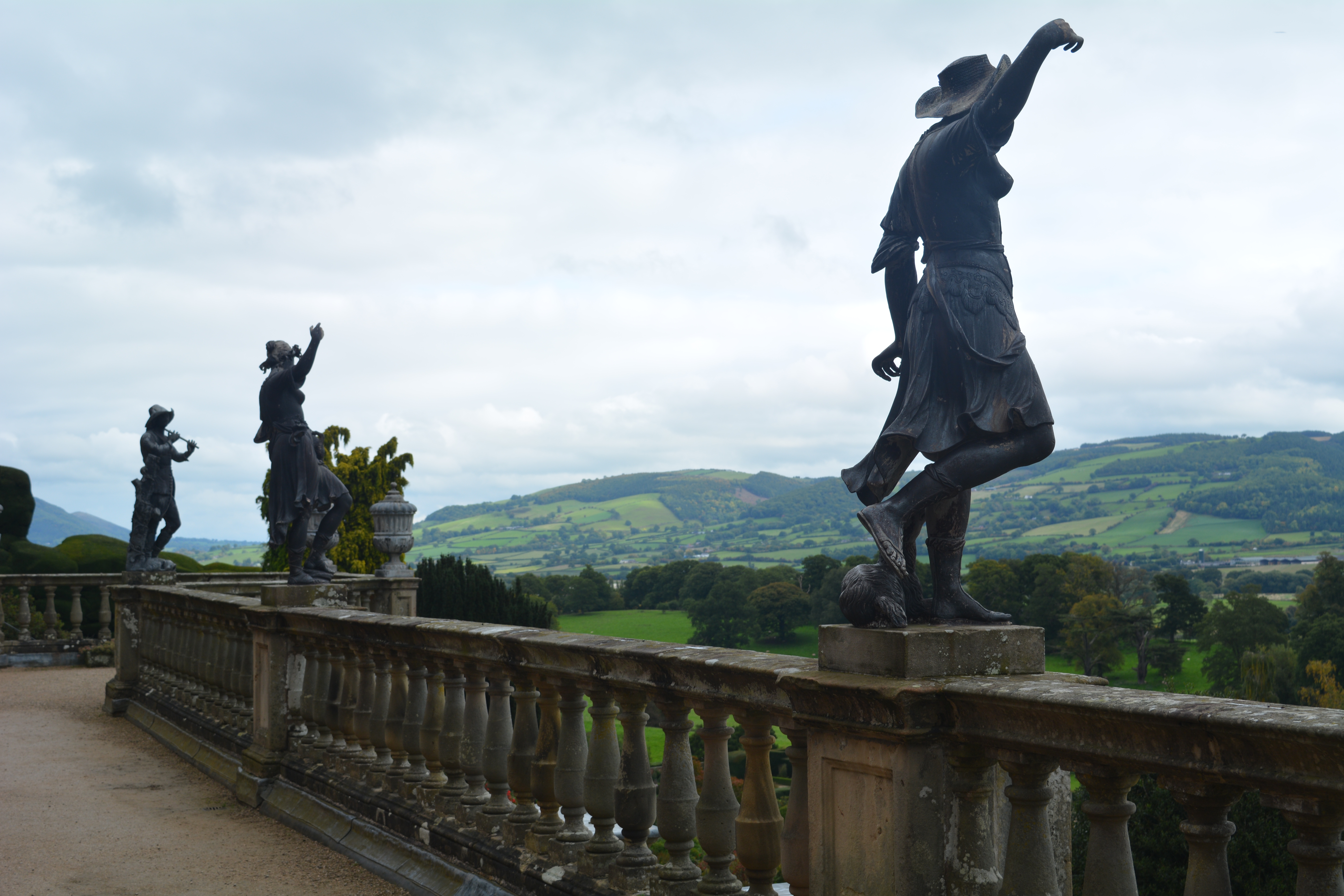 First we shall have a look at views along the borders and looking out over the terraces. Powys is renown for its ancient sculpted yew hedging which appears now and again as we walked the terraces. Sculpted figures stand atop the stone balustrades in places overlooking the views.