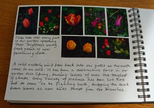I began by writing a few words, “April means tulips, tulips ……” and at the end of the two pages, “……. and yet more tulips.”