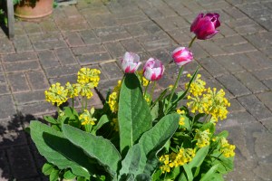 Around the corner of the house we met the owner who did most of the gardening and his rather grumpy dog, Freddie. We immediately noticed a circle of colourful tulips and nearby a lovely seating area and a wisteria draped pergola.
