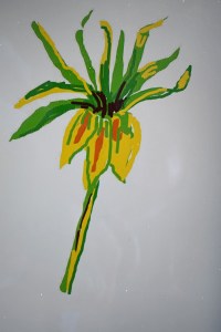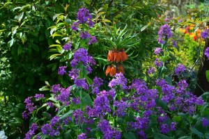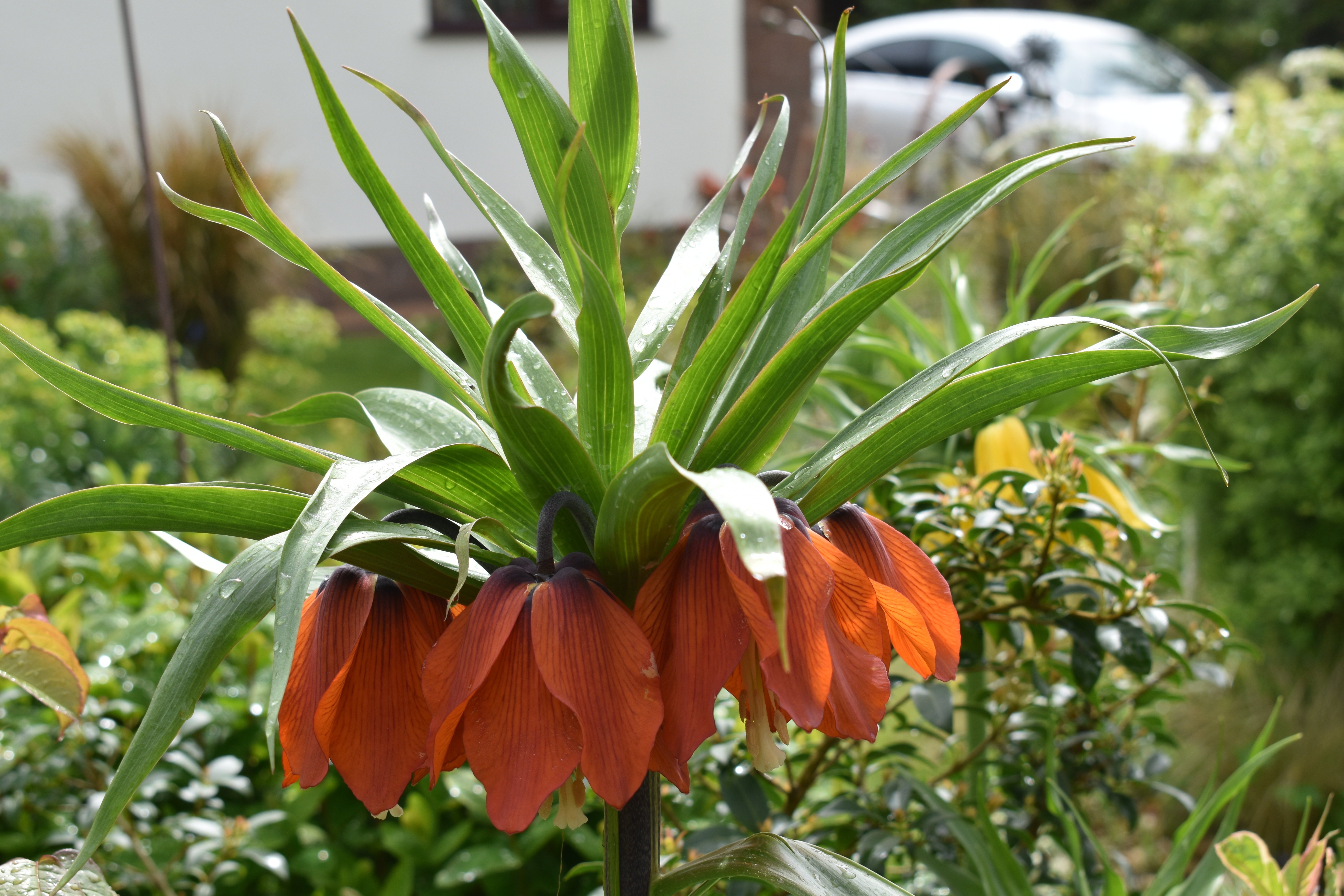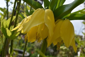 “Flowering plant of the month for April is the very bright extravagant looking Fritillaria imperialis. We grow just two in our Shrub Garden, F.i. ‘Willliam Rex’ which is a rich orange-red colour with each flower topped in purple, and F. i. ‘Lutea’ a beautiful clear yellow one. But they attract the dreaded Lily Beetles!!”