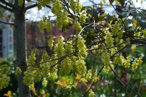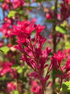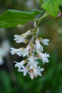 One spring flowering shrub that we enjoy in our own garden are ribes, the flowering currants. We grow red, yellow, white and bicolour ones. We really liked this dark flowered one growing here at Bridgemere which sadly was not labelled.