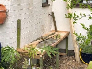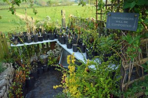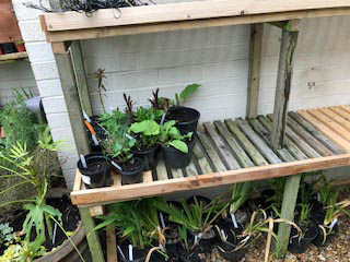 I wrote, “When we host visitors to our garden we sell plants and Jude has established what we call her ‘micro nursery’. We also take plants with us when we give garden talks around counties close to us and in neighbouring Welsh counties. We needed to increase our nursery space as we go out to give talks more and more. I doubled the size of Jude’s herbaceous plant sales shelves. We mostly used re-cycled wood.”