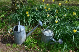 “Potting up our dahlias and brushing up birch catkins blown down by strong winds.”
