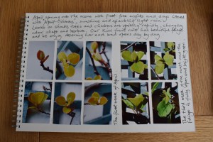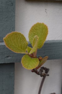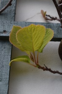 On my first page I featured the Kiwi Vine, the climbing plant which opens with beautiful moss green leaf buds which turn a purer green as the days progress. I wrote, “April sprung onto the scene with frost-free nights and days littered with ‘April Showers’, sunshine and sparkling light rain. Leaves change on shrubs, trees and climbers are opening rapidly, changing colour, shape and texture. Our Kiwi Vine has beautiful foliage and we enjoy observing how each bud opens day by day.”